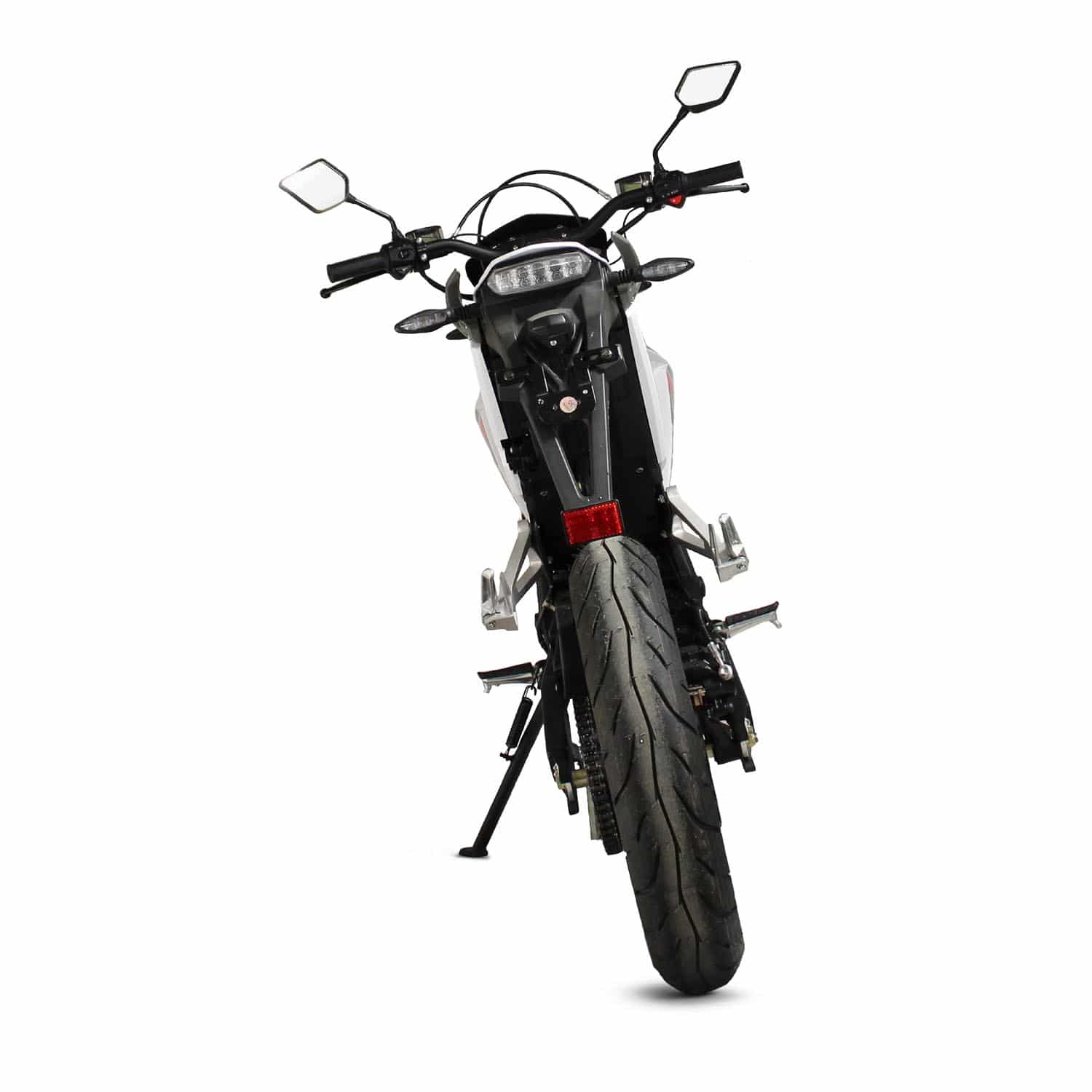 Le compteur digital est clair, lisible. Contrasté. Très bon point, l’instrumentation de la Masai Vision 3000 est complet. Outre la vitesse instantanée, on retrouve le kilométrage total, un indicateur de reste de charge batterie, une horloge, de la température moteur, puis le mode de conduite sélectionné. Seul point noir, on regrettera peut-être l’absence d’un kilométrage partiel (trip). Ce supermotard électrique est équipé d’une double prise USB, une en 1A, l’autre en 2.1A. Pratique pour recharger son smartphone lors d’une balade, d’un rendez-vous ou d’un trajet domicile-travail voire domicile-lycée. Elle dispose, de série, d’une clef de démarrage sans contact, d’une alarme, de feux et clignotants LED, d’une béquille latérale, de warning, d’un crochet pour casque et de poignées pour le passager.