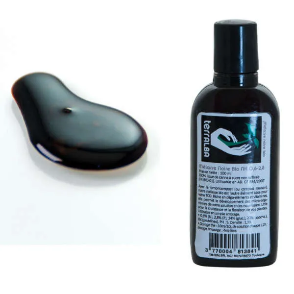 - Arrosage : diluez 2mL de mélasse noire dans 1 litre d’eau.