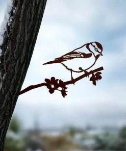 Fabriquée dans un matériau d’extérieur solide, l’acier corten, la mésange huppée, au fil du temps se couvrira d’une couche de rouille.