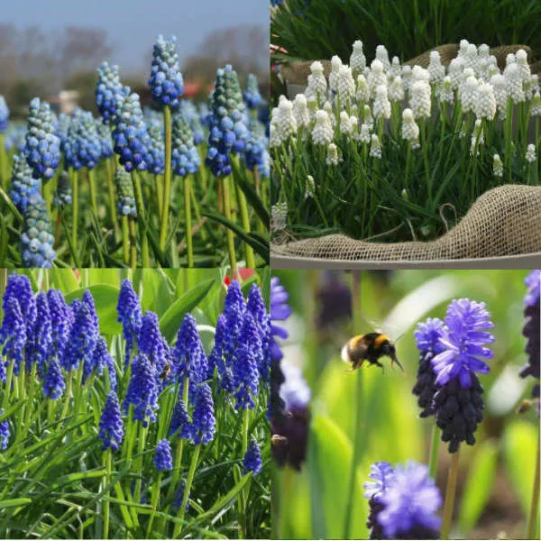 Ce mélange de bulbes de muscaris vous permet de créer un joli parterre coloré. N’hésitez pas à planter plusieurs dizaines de bulbes au même endroit.