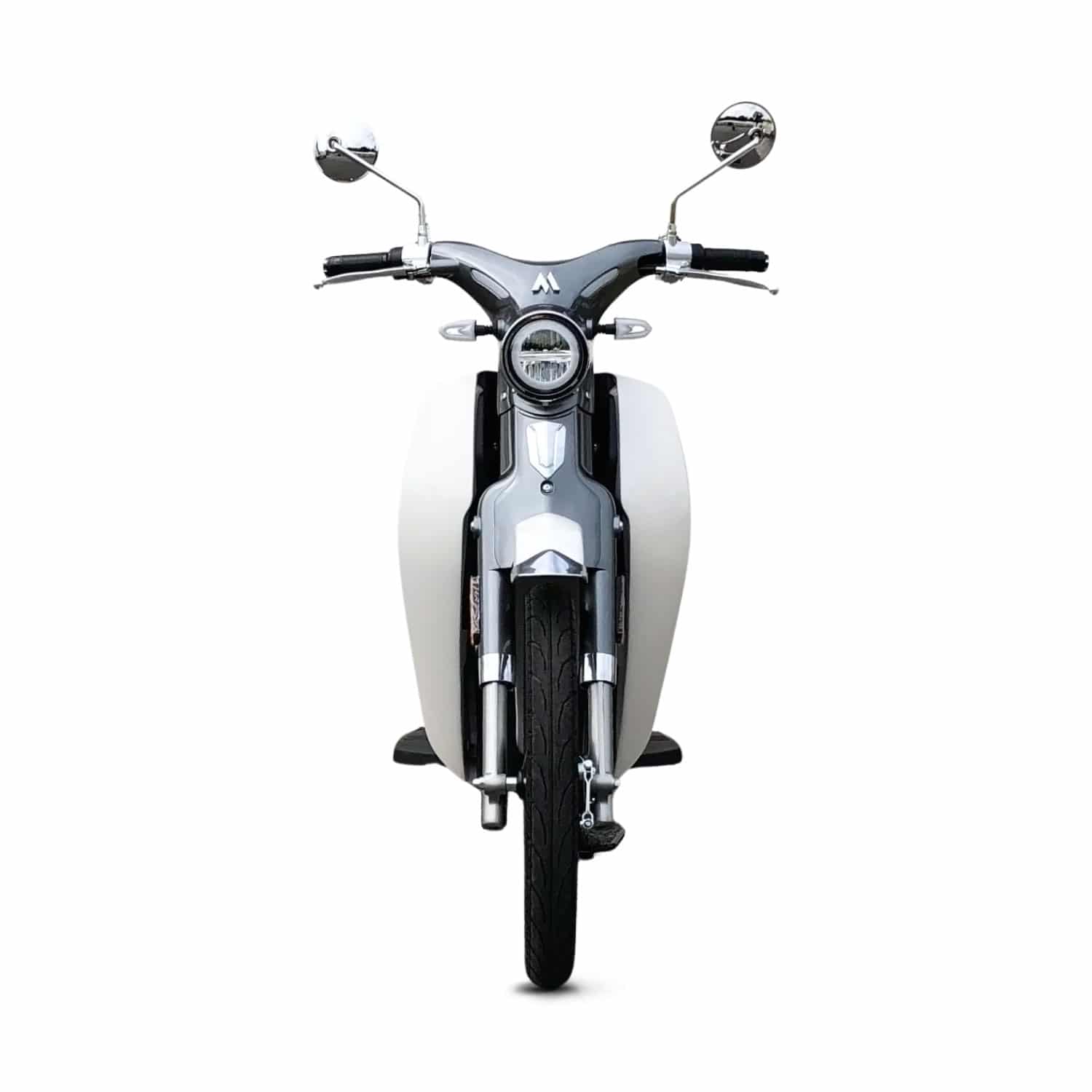Le Motron Cubertino joue la carte du néo rétro partout où cela est possible. Les jantes sont à rayons – ce qui est relativement peu commun sur un deux roues électrique – et ses freins sont à tambour. Bien que flambant neufs, ceux-ci sont issus d’une technologie déjà ancienne et depuis longtemps remplacée par des freins à disques autrement plus efficaces. Malgré cela et grâce à la légèreté de ce scooter électrique, le freinage reste satisfaisant. Les roues de 17 pouces assurent une bonne inertie et une bonne tenue de route.