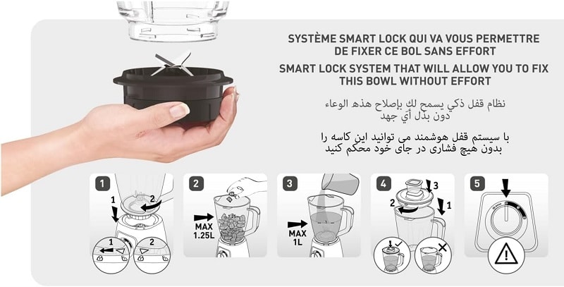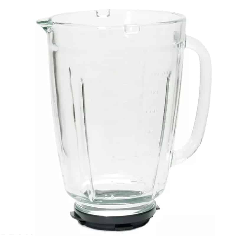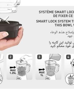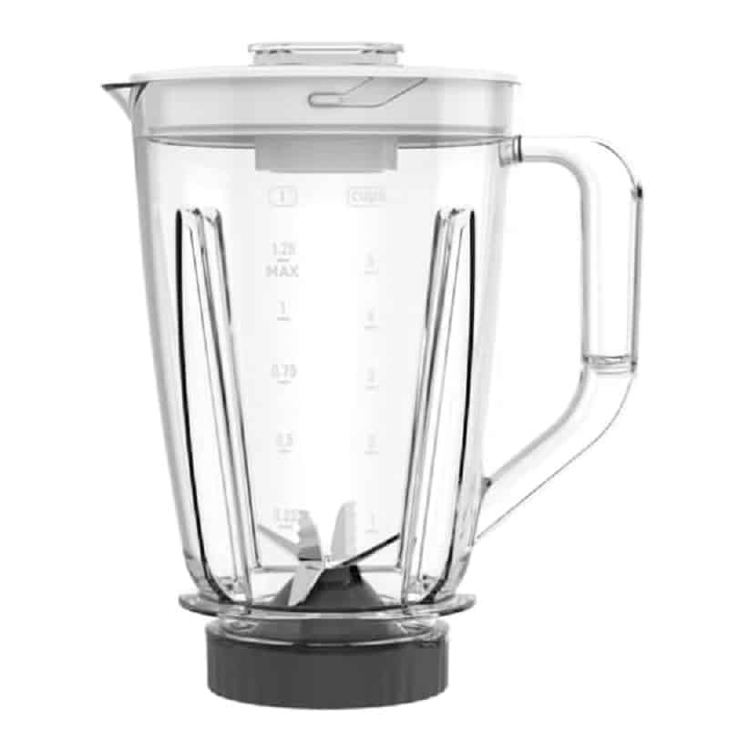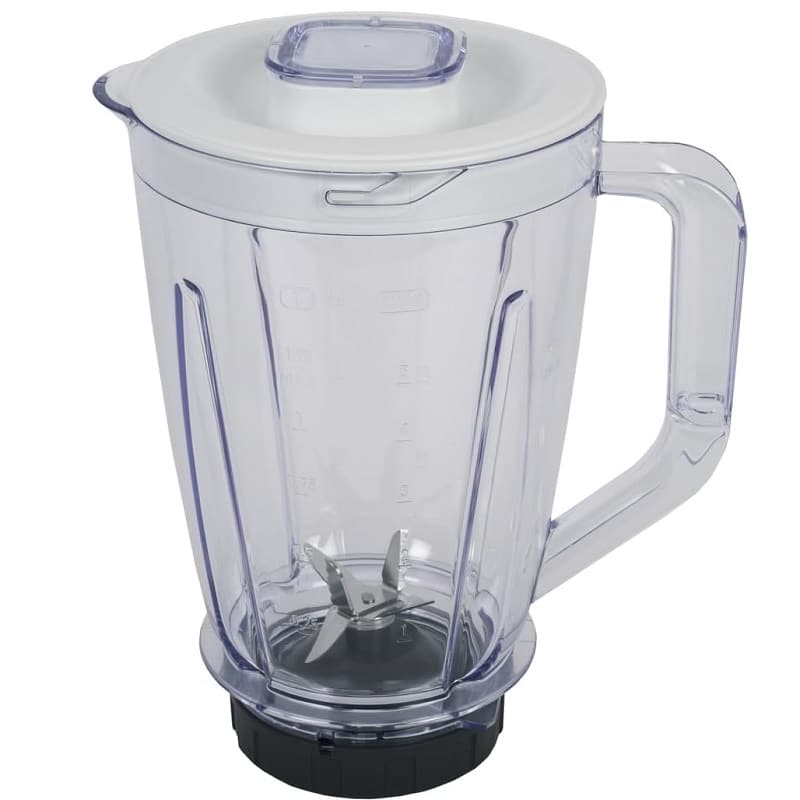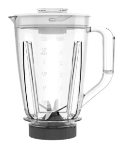 - Bol mélangeur complet en plastique (bol + lame + couvercle + bouchon) d’une capacité de 1,25 l.