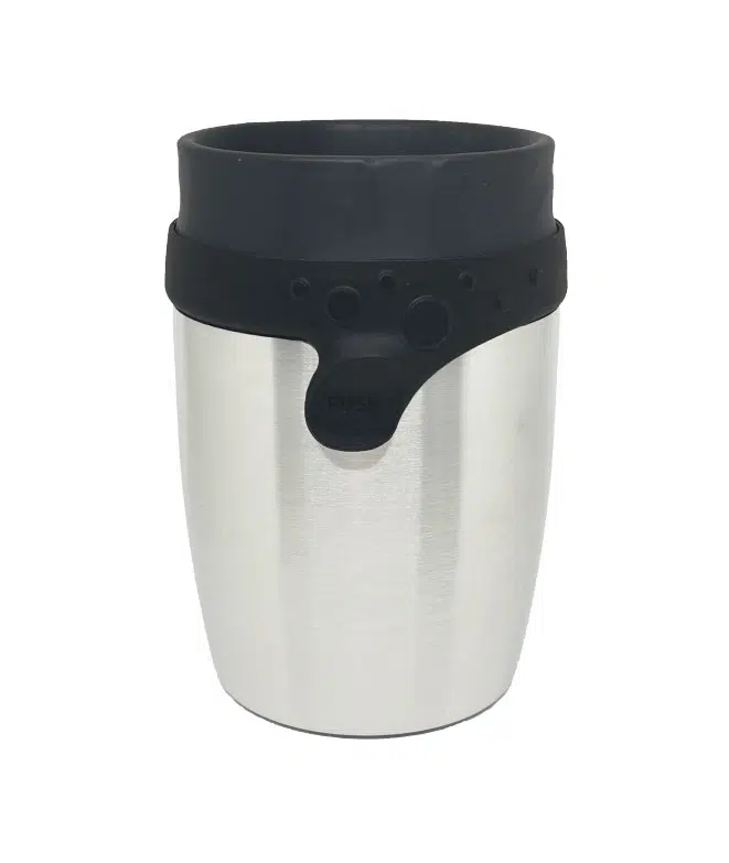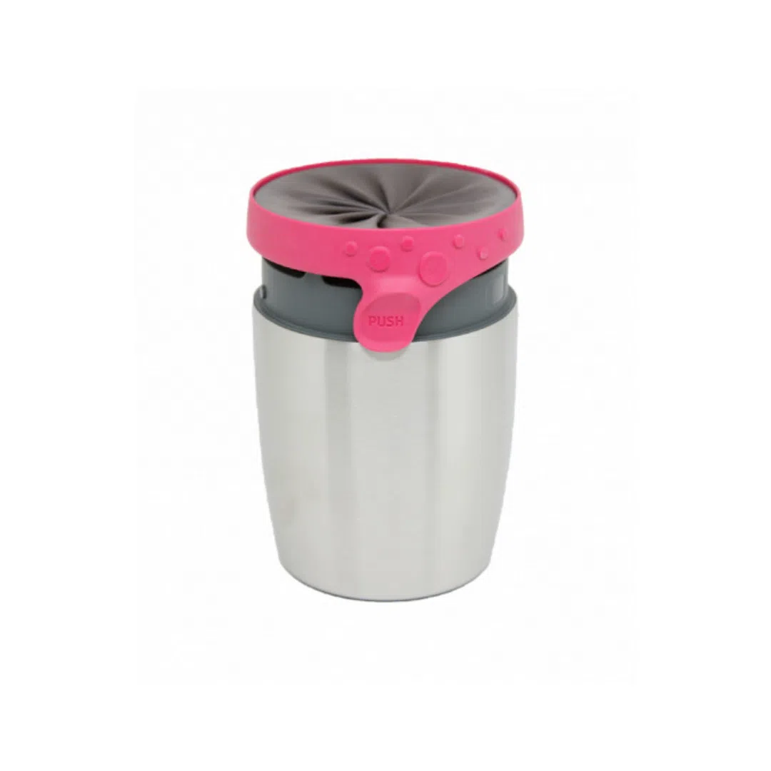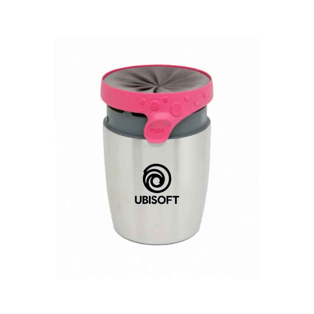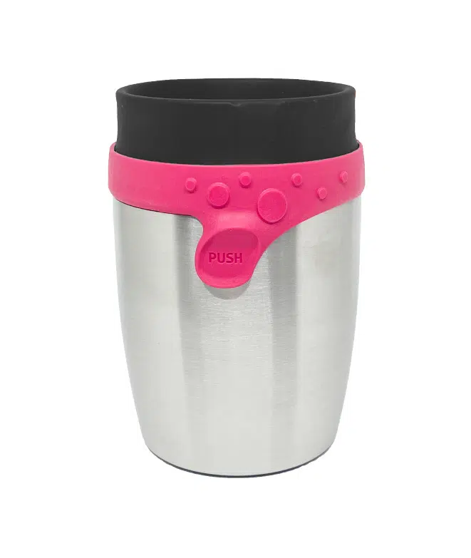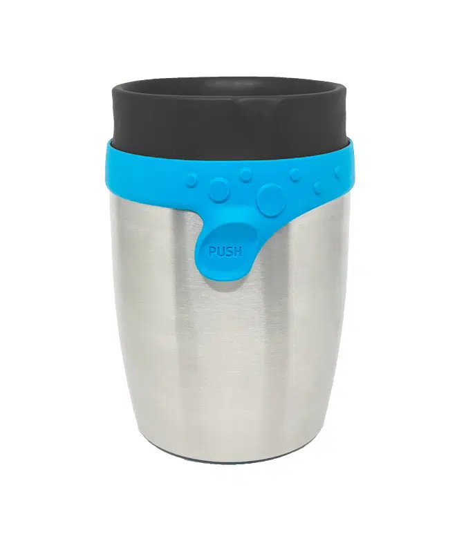 Mug isotherme en inox Made in France de 200 ml, étanche avec fermeture brevetée twist, dimensions 12 x 8 cm. Personnalisable en tampographie 1 ou 2 couleurs, gravure laser ou sérigraphie (zones 30 x 40 mm ou 230 x 50 mm). Finition avec bague colorée et membrane noire ou rouge.