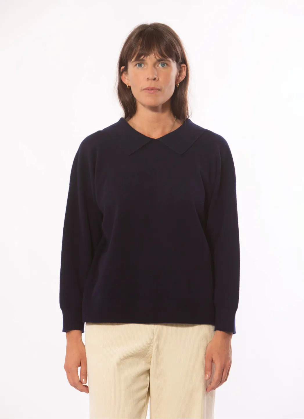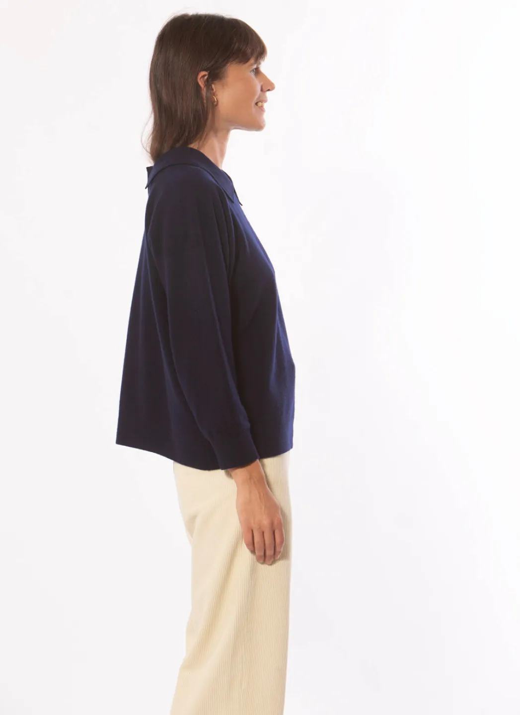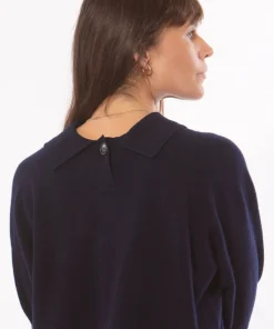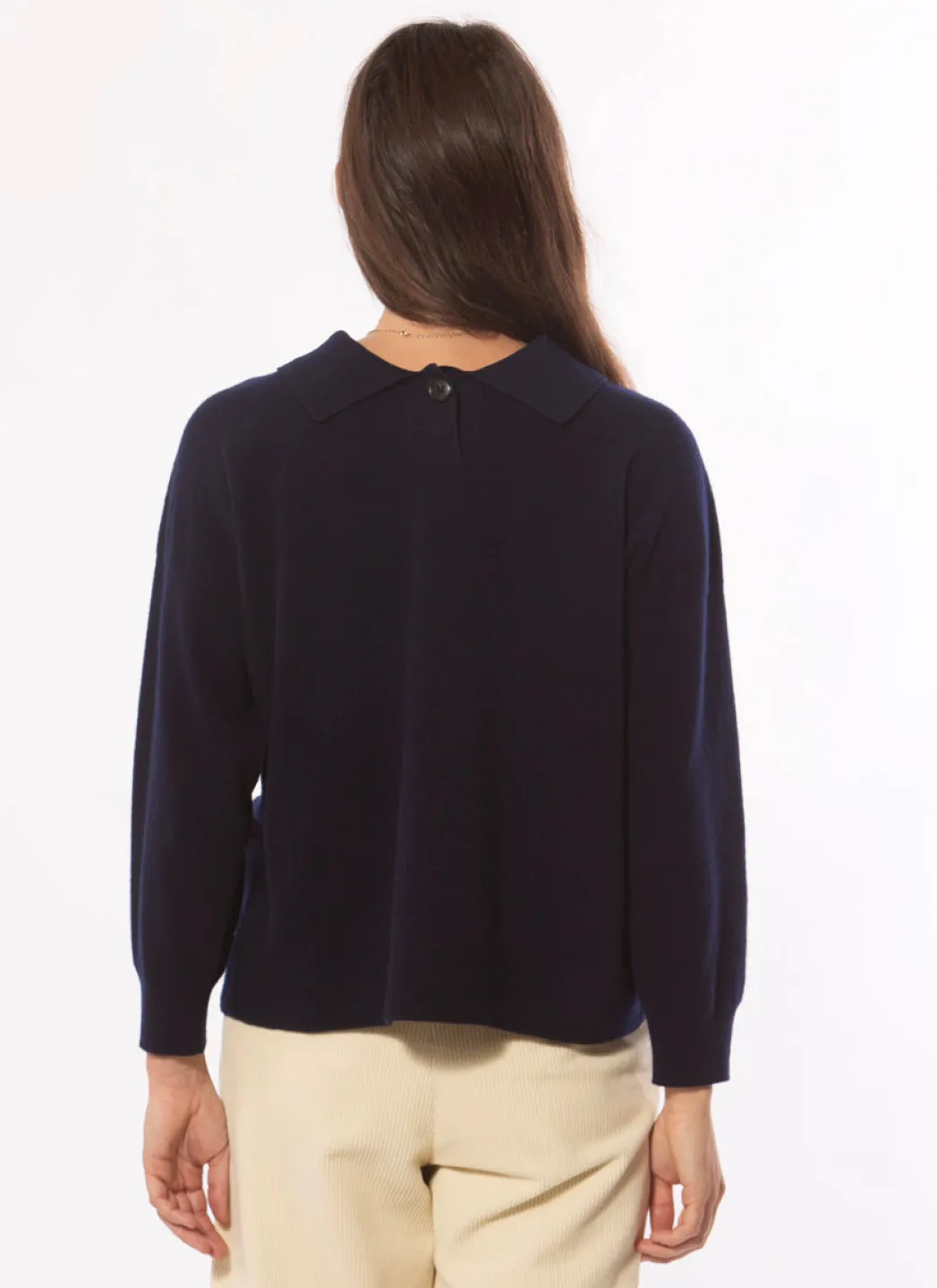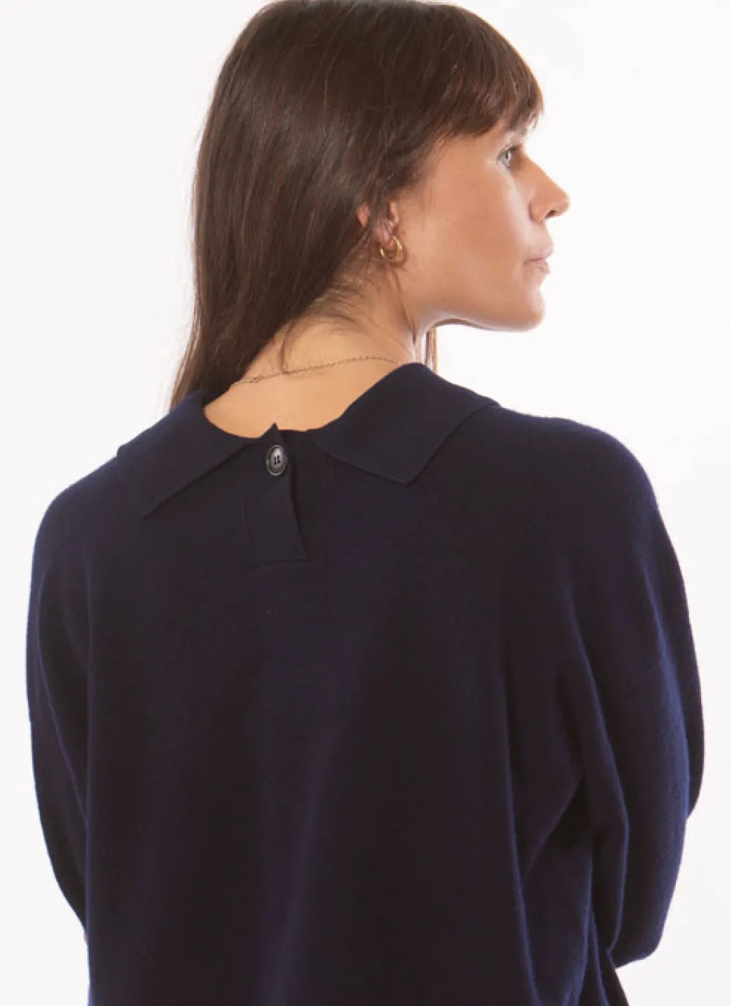 Pull polo de poids moyen en laine mérinos douce qui peut être porté de deux façons, avec le bouton devant ou dans le dos. Coupe décontractée qui laisse le pull se draper joliment sur le corps sans être trop ample. Ourlet droit et bordures côtelées aux bras.