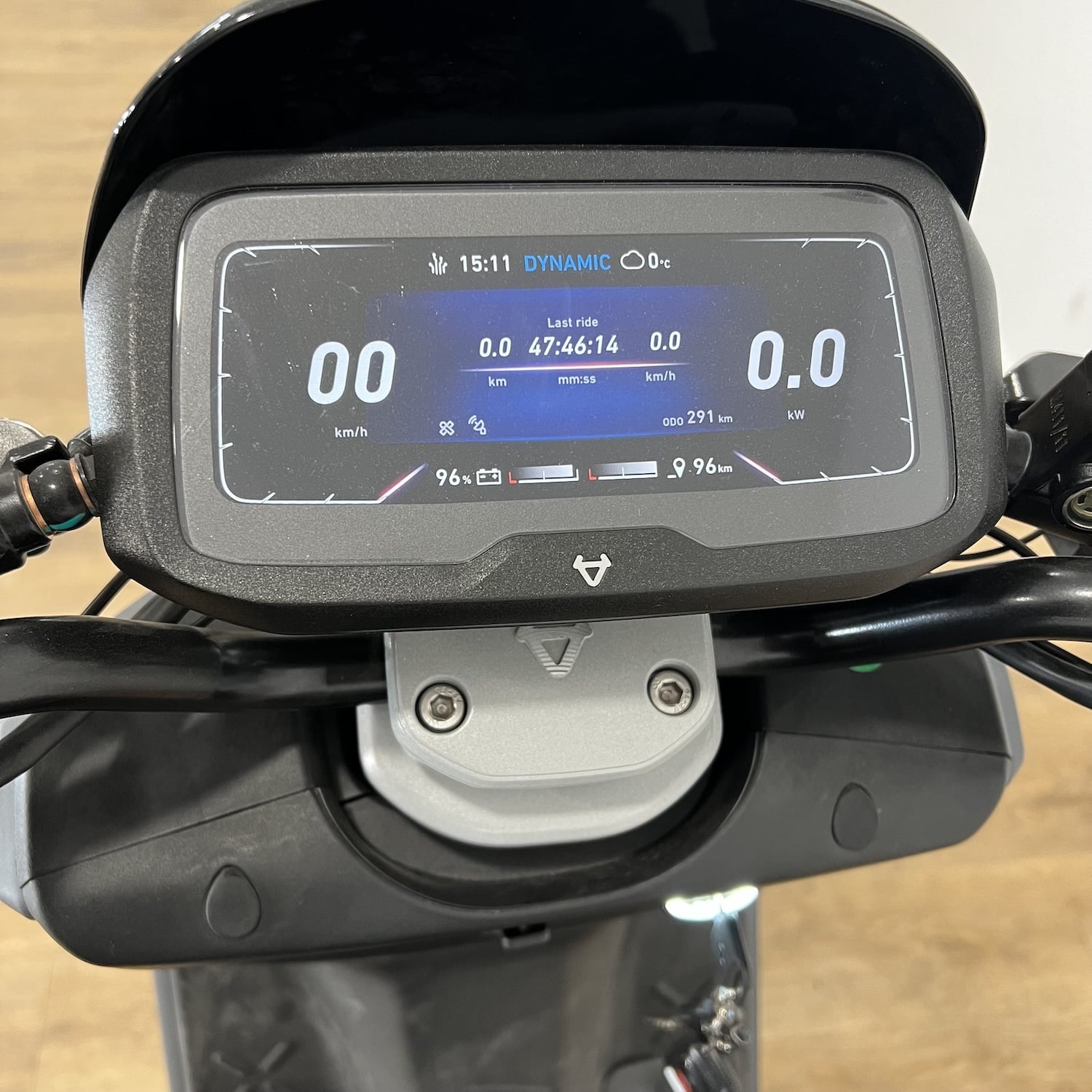 Le Niu NQi GTS dispose d’un écran de bord digital et dynamique. Cet écran est une référence : sur le marché, en 2023, il n’est pas possible de trouver mieux. On y trouve les classiques : vitesse instantanée, autonomie restant des batteries, clignotants, odomètre, etc. Mais aussi, l’heure, la température extérieure, la consommation moyenne.