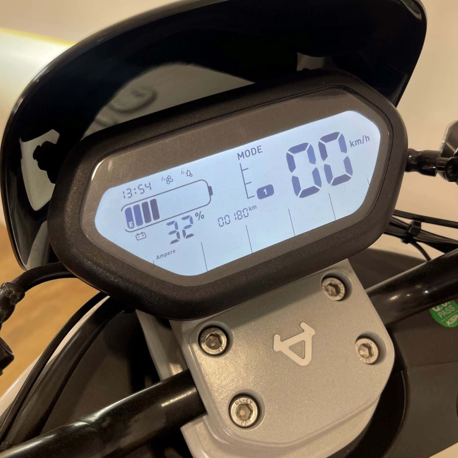 - La première possède une autonomie maximale de 80 kilomètres. Sa batterie lithium-ion amovible de 2,1 kWh (60V / 35 Ah) dispose d’accumulateurs fournis par Panasonic. Il s’agit d’un chiffre constructeur : dans la réalité, en ville, avec son lot d’arrêts et de redémarrages, l’autonomie réelle pourra approcher les 60 kilomètres.