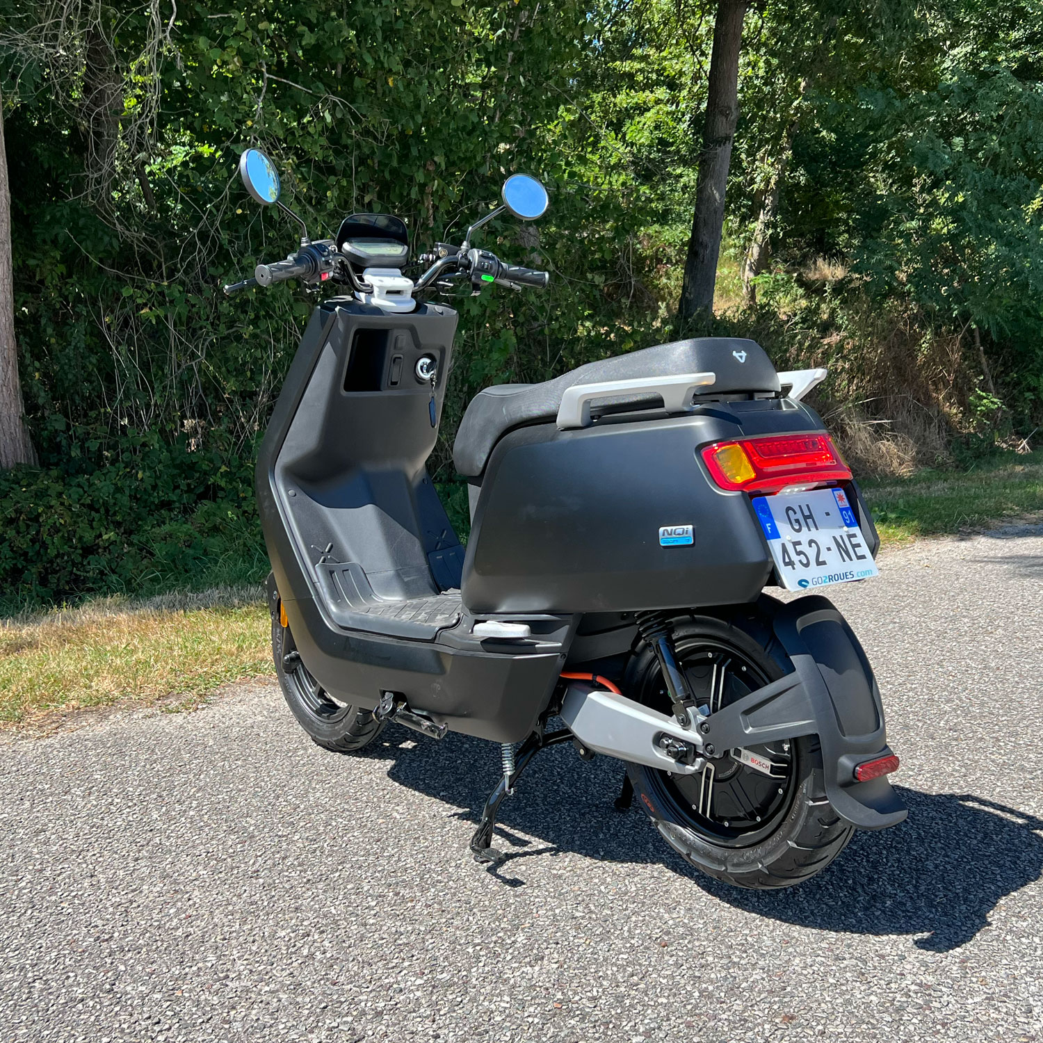 Son moteur est de type Hub Brushless. Il est intégré dans la roue arrière. Celui-ci est manufacturé par la marque allemande Bosch et délivre une puissance nominale de 1 800W avec un couple maximal de 130 Nm. Ce moteur est silencieux et très économique au quotidien. Réaliser 100 kilomètres au guidon du Niu NQi Sport coûtera environ 0.40 € d’électricité. Pour en savoir plus sur les économies à réaliser grâce à la conduite d’un scooter électrique, vous pouvez consulter notre simulateur d’économie.