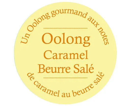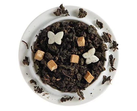 Thé semi-fermenté, morceaux de caramel, papillons blancs en sucre.