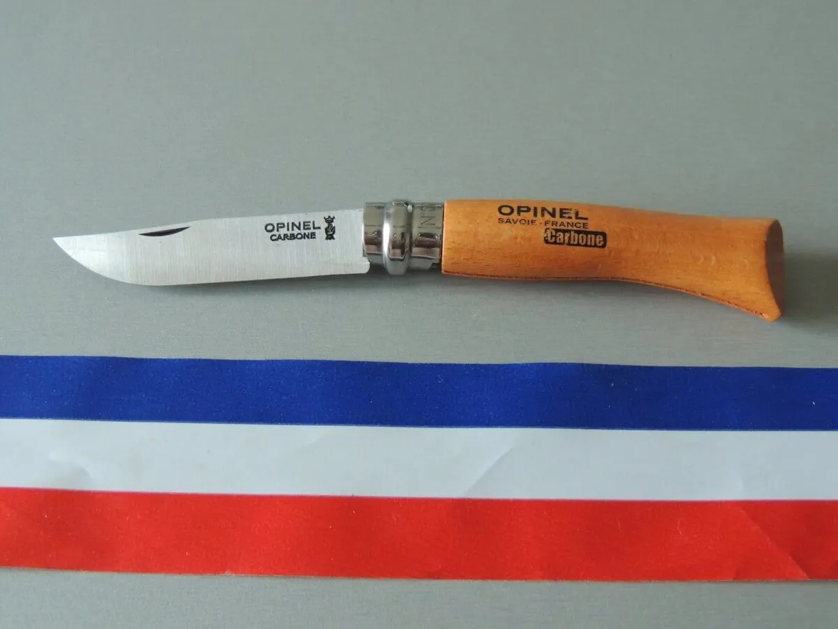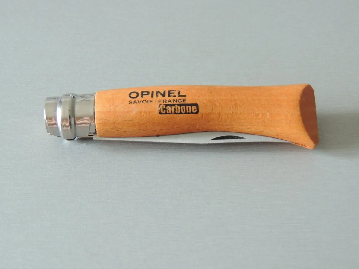 - L’acier au carbone Opinel est un acier non allié, à haute teneur en carbone permettant d’obtenir après l’opération de traitement thermique l’excellente dureté qui garantit une parfaite tenue du tranchant ainsi qu’une grande résistance à l’usure et un réaffûtage facile. Cependant l’acier au carbone ayant une faible résistance à la corrosion par l’humidité, il nécessite des précautions d’utilisation : ne laissez pas votre couteau en milieu humide notamment en lave-vaisselle, essuyez la lame avec un chiffon gras après usage et graissez la souvent ainsi que son articulation.