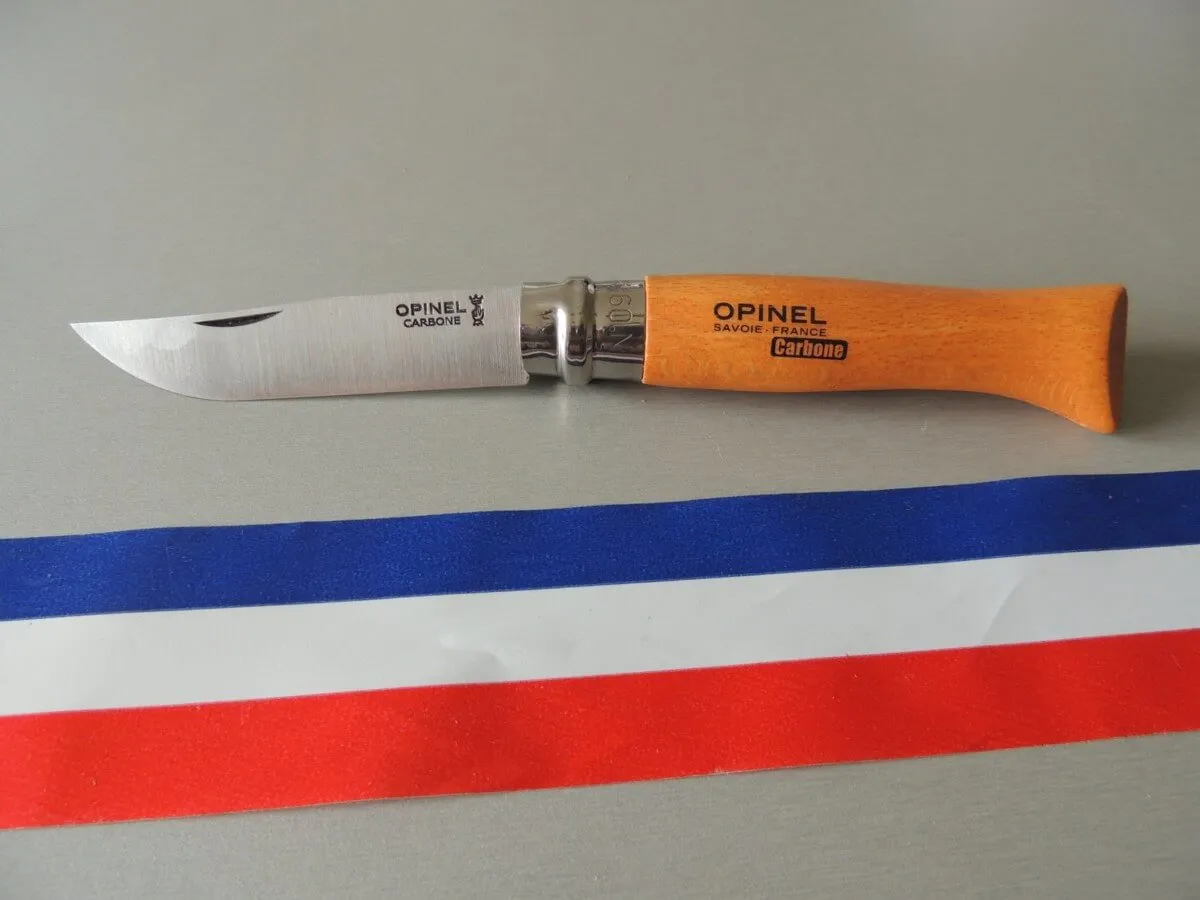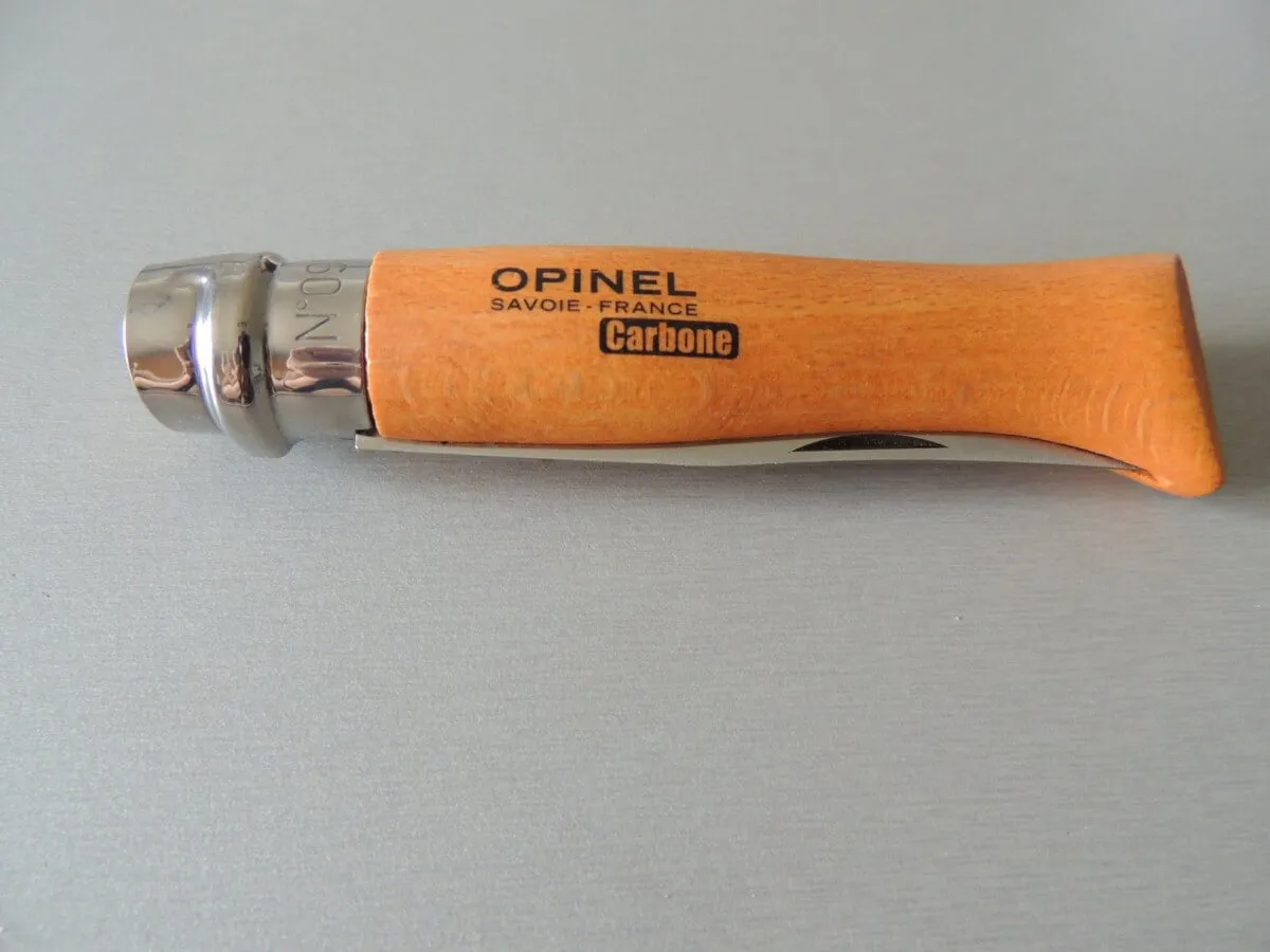 - L’acier au carbone Opinel est un acier non allié, à haute teneur en carbone permettant d’obtenir après l’opération de traitement thermique l’excellente dureté qui garantit une parfaite tenue du tranchant ainsi qu’une grande résistance à l’usure et un réaffûtage facile. Cependant l’acier au carbone ayant une faible résistance à la corrosion par l’humidité, il nécessite des précautions d’utilisation : ne laissez pas votre couteau en milieu humide notamment en lave-vaisselle, essuyez la lame avec un chiffon gras après usage et graissez la souvent ainsi que son articulation.