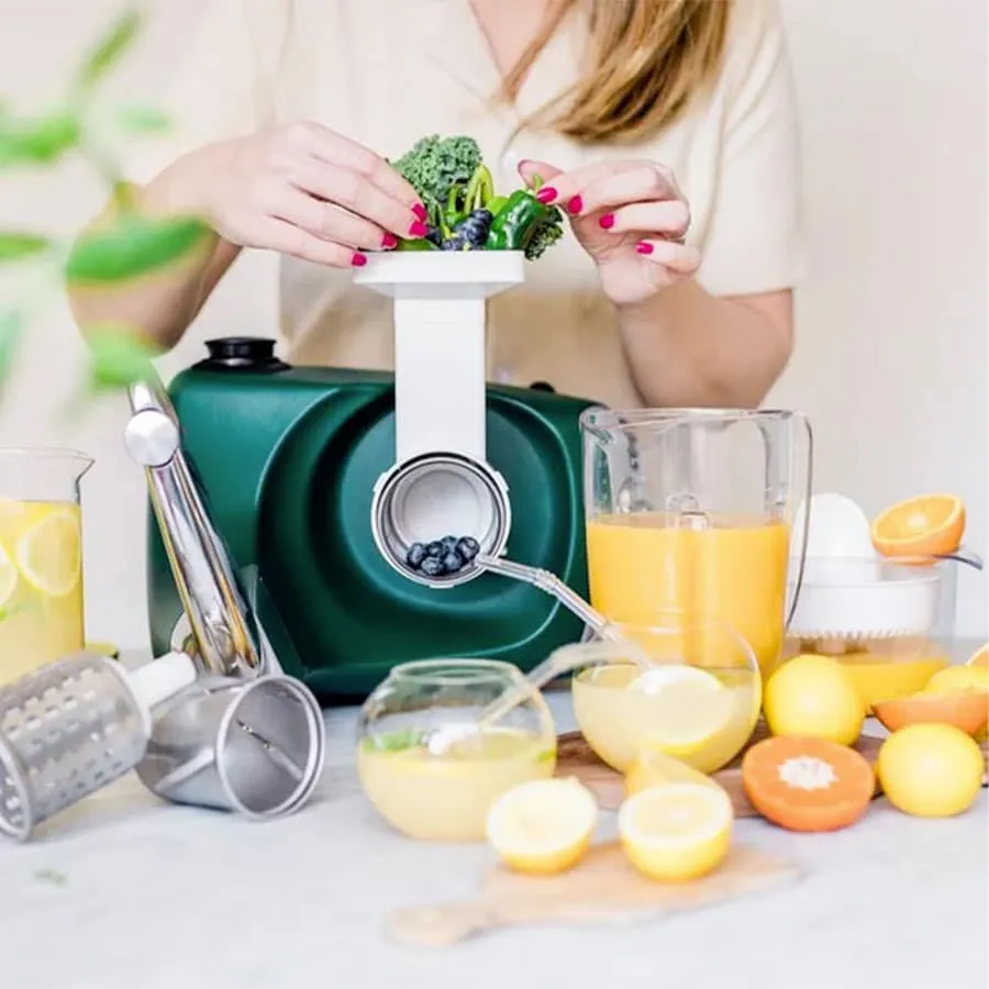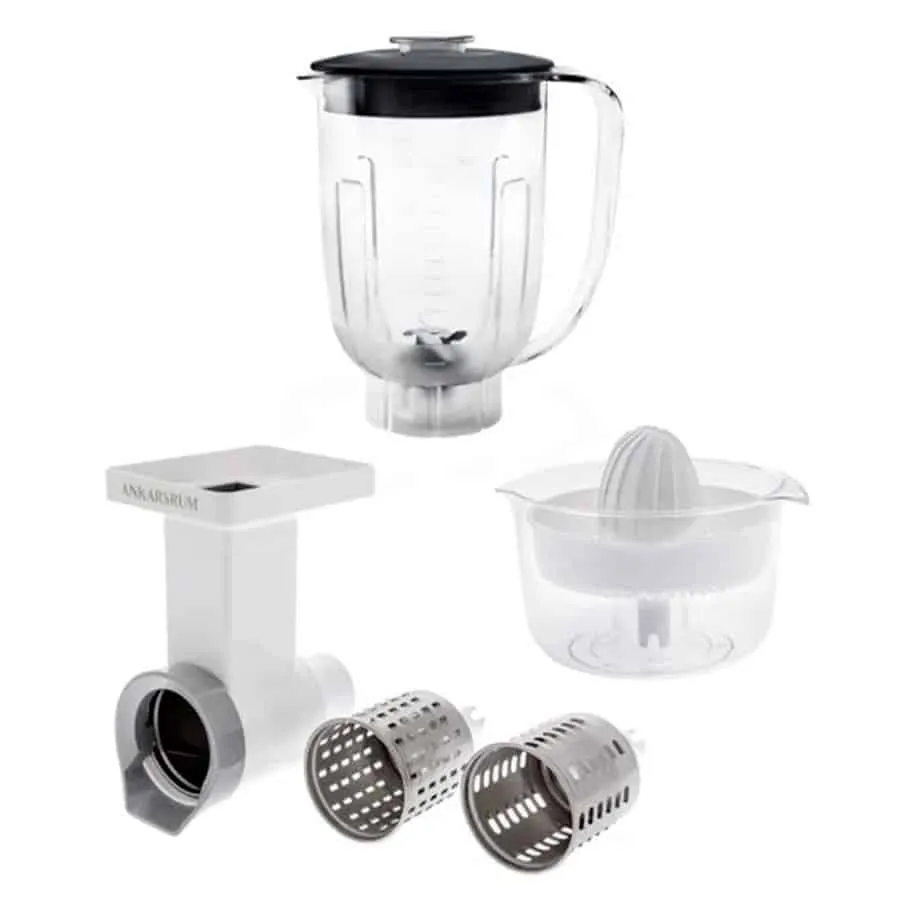 Pack d’accessoires pour robot pâtissier : Blender, presse-agrumes, coupe-légumes, 3 râpes.