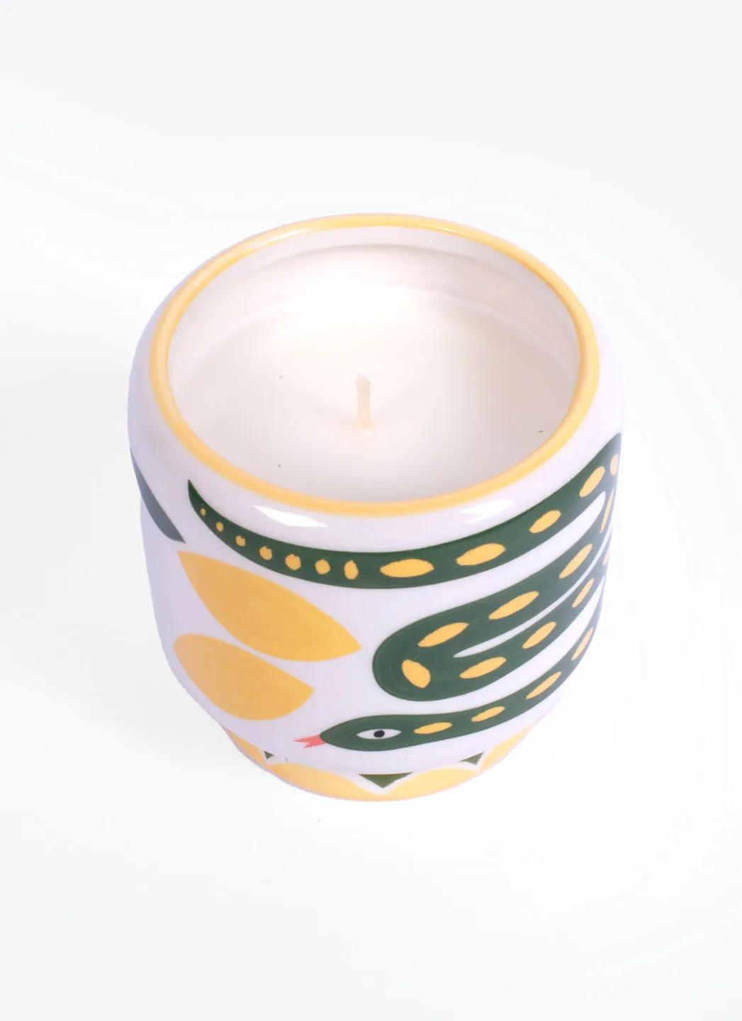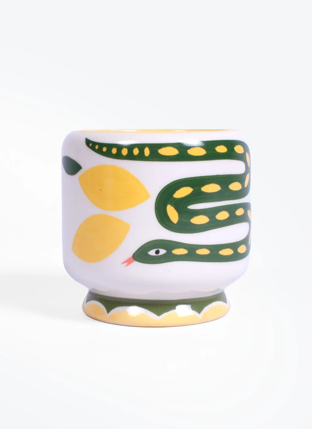 Bougie en cire de soja peinte à la main, aromatisée aux citronnelle, pour égayer votre étagère ou votre table pendant les sombres journées d’hiver. Elle peut également servir de porte-stylos ou de petit vase lorsqu’elle est vide.