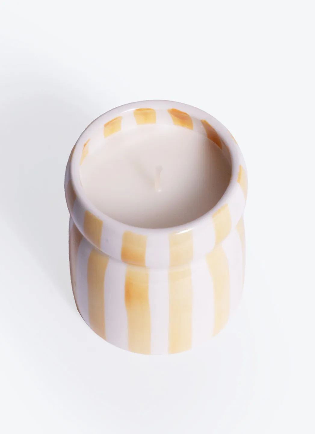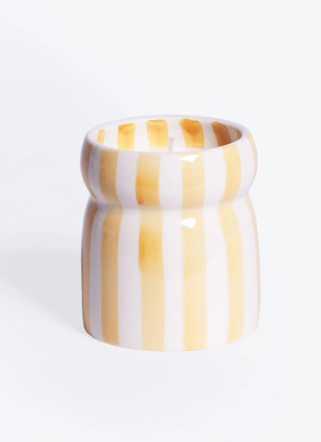 Ces bougies peintes à la main par Paddywax s’inspirent des parapluies rayés. Elles ont une contenance de 6,5 oz et une forme pincée unique.