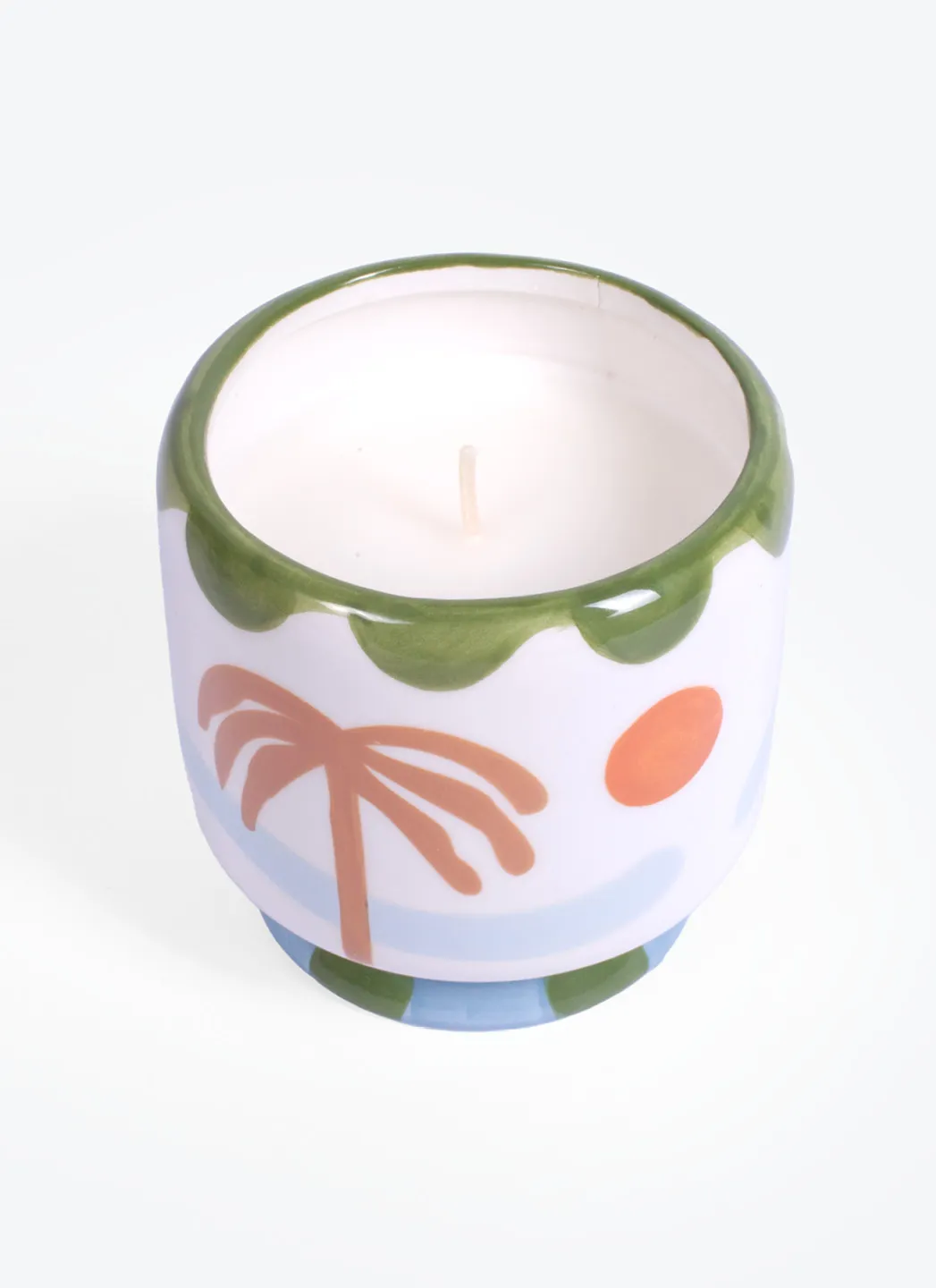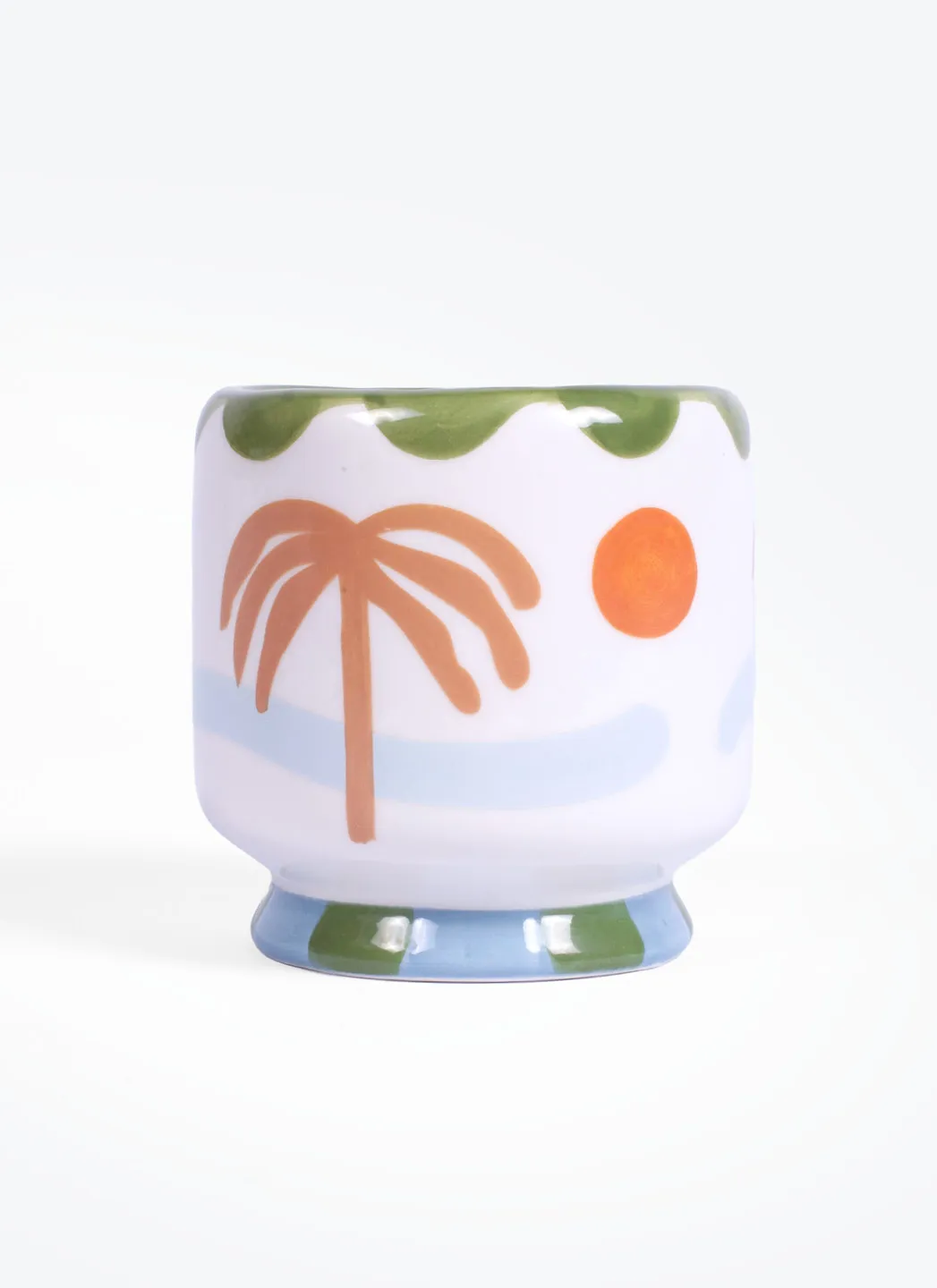 Bougie en cire de soja peinte à la main, aromatisée aux palmier, pour égayer votre étagère ou votre table pendant les sombres journées d’hiver. Elle peut également servir de porte-stylos ou de petit vase lorsqu’elle est vide.