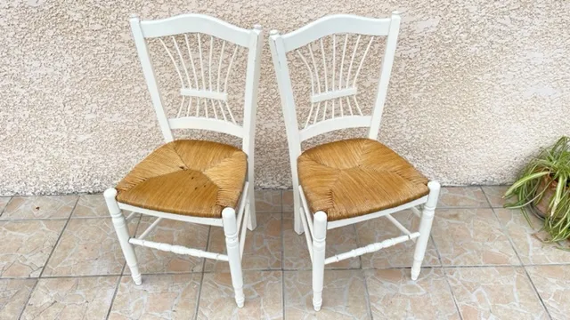 Jolie Paire de CHAISES Anciennes Cannées BLANCHES en bois, des chaises des Années passées au Format unique.