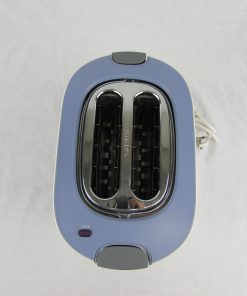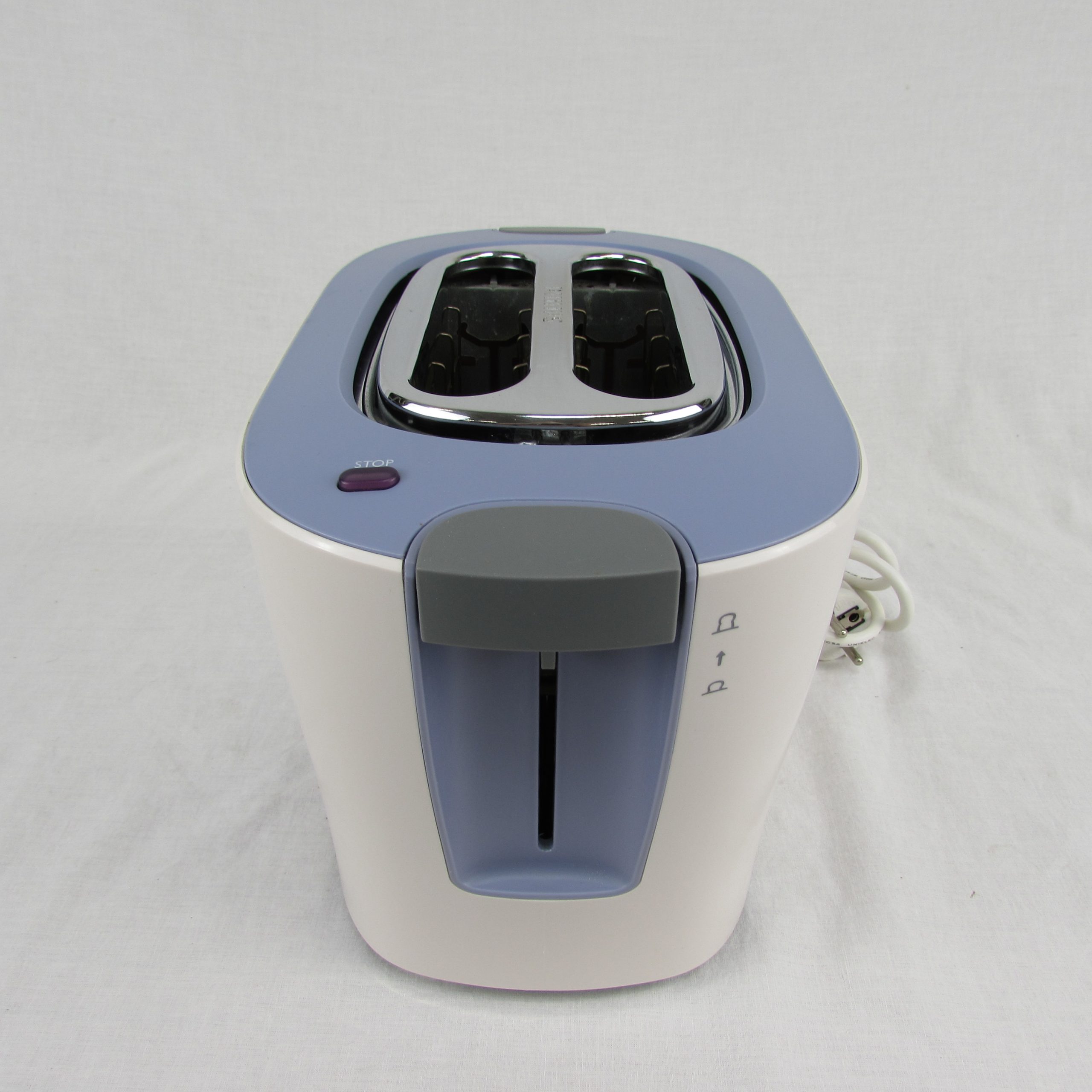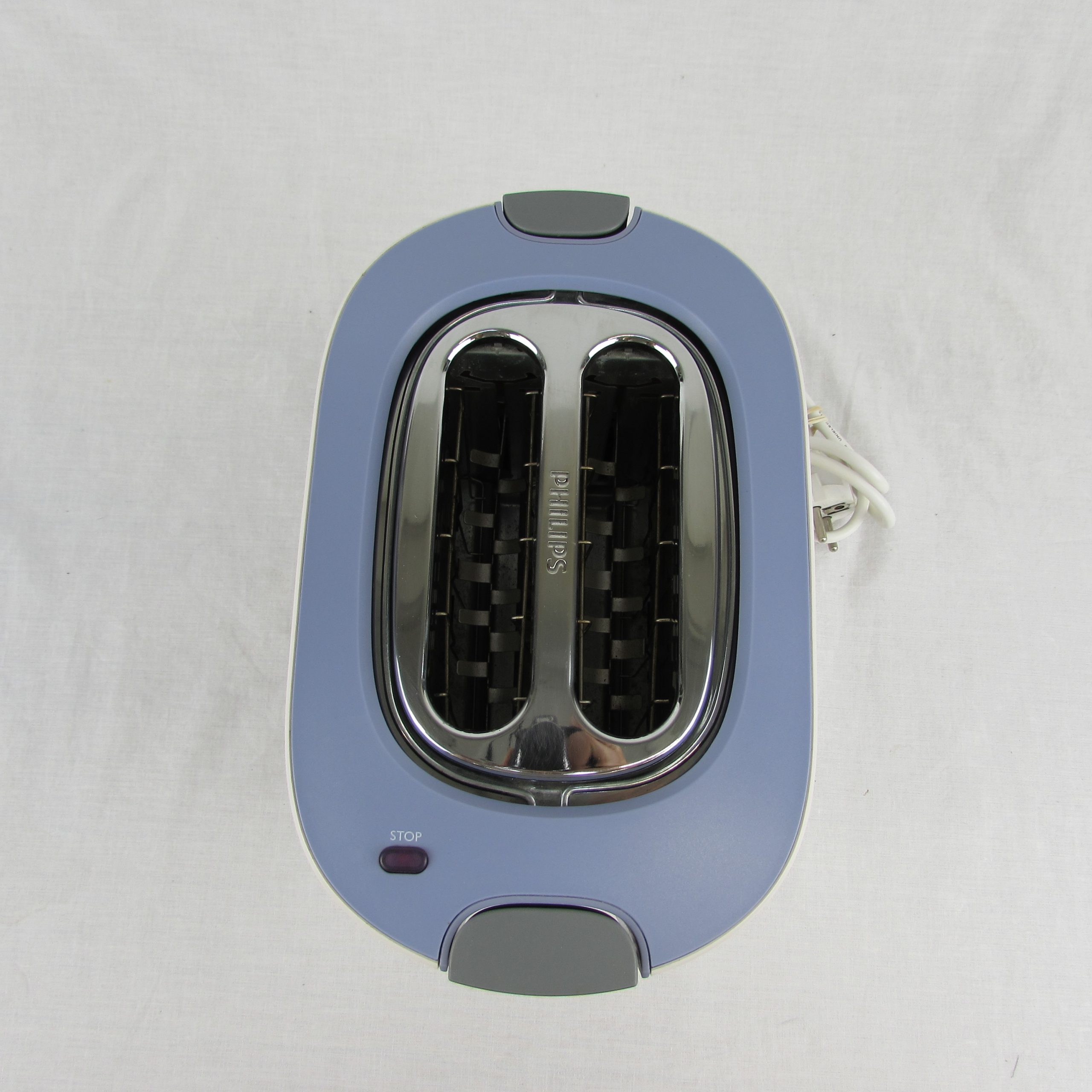 Grille pain PHILIPS Viva HD2630 d’occasion, couleur bleu et blanc, puissance 1000W, 2 fentes ultralarges, tiroir ramasse-miettes amovible, fentes à centrage automatique, bouton éjection.