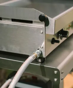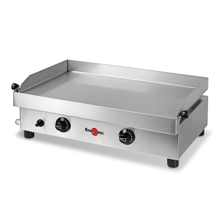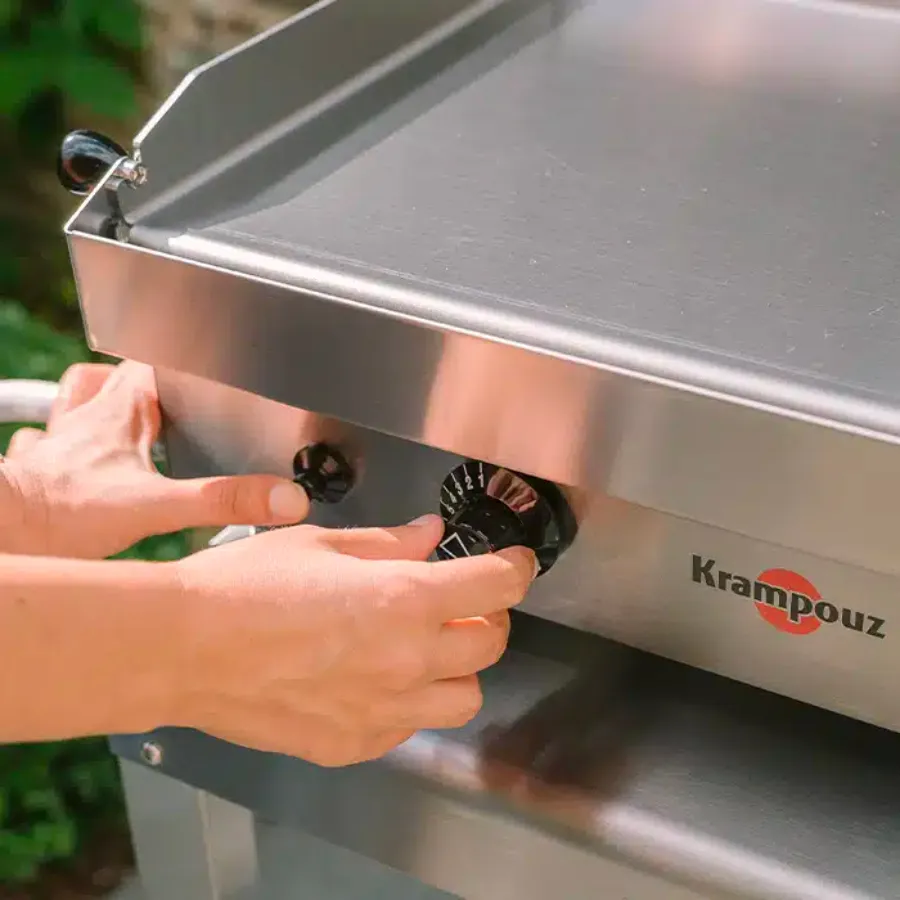 Compatible au gaz butane ou propane, découvrez la plancha Krampouz samba gaz 2 feux avec sa plancha en acier inoxydable idéale pour 4 à 6 personnes.