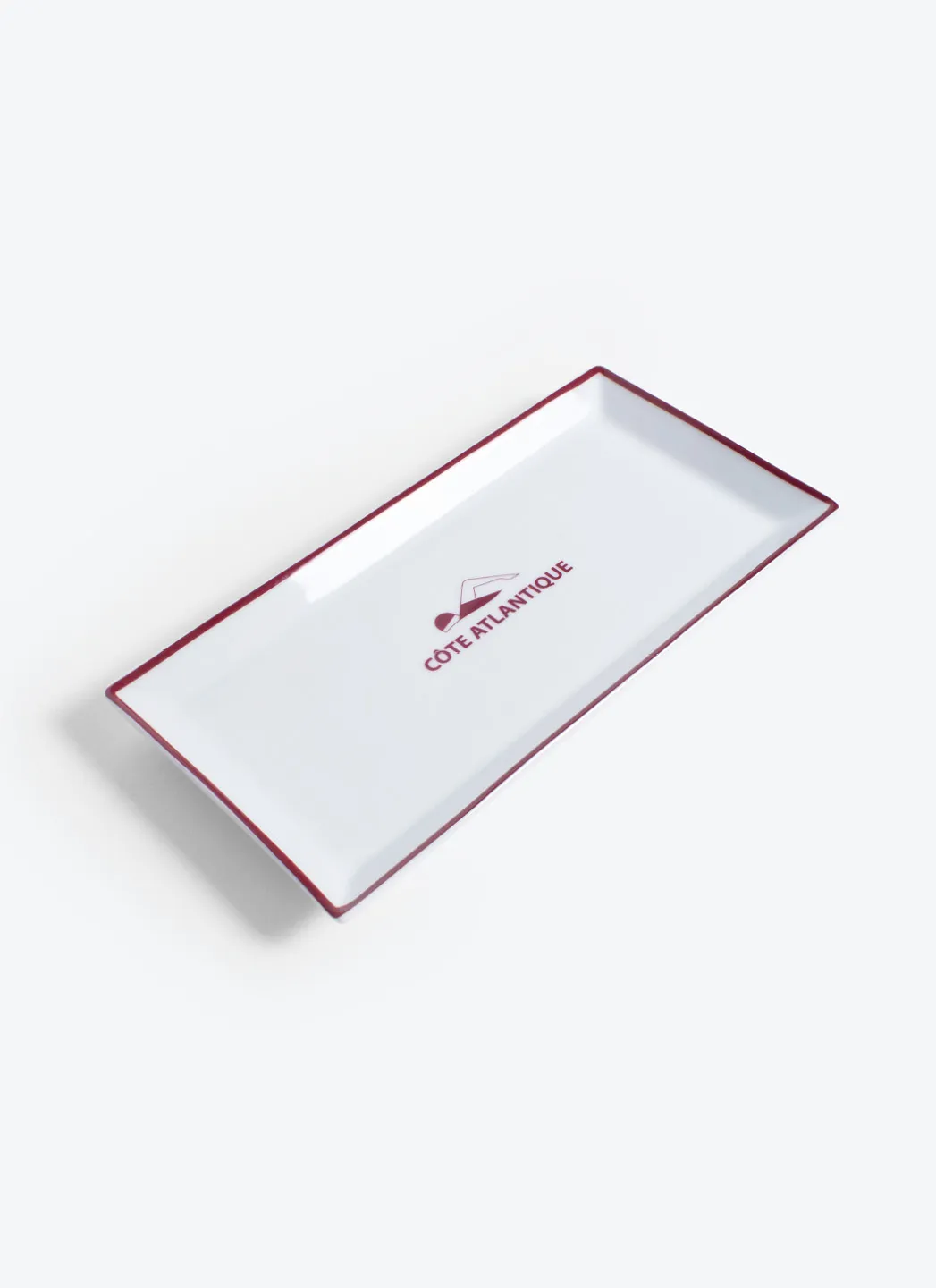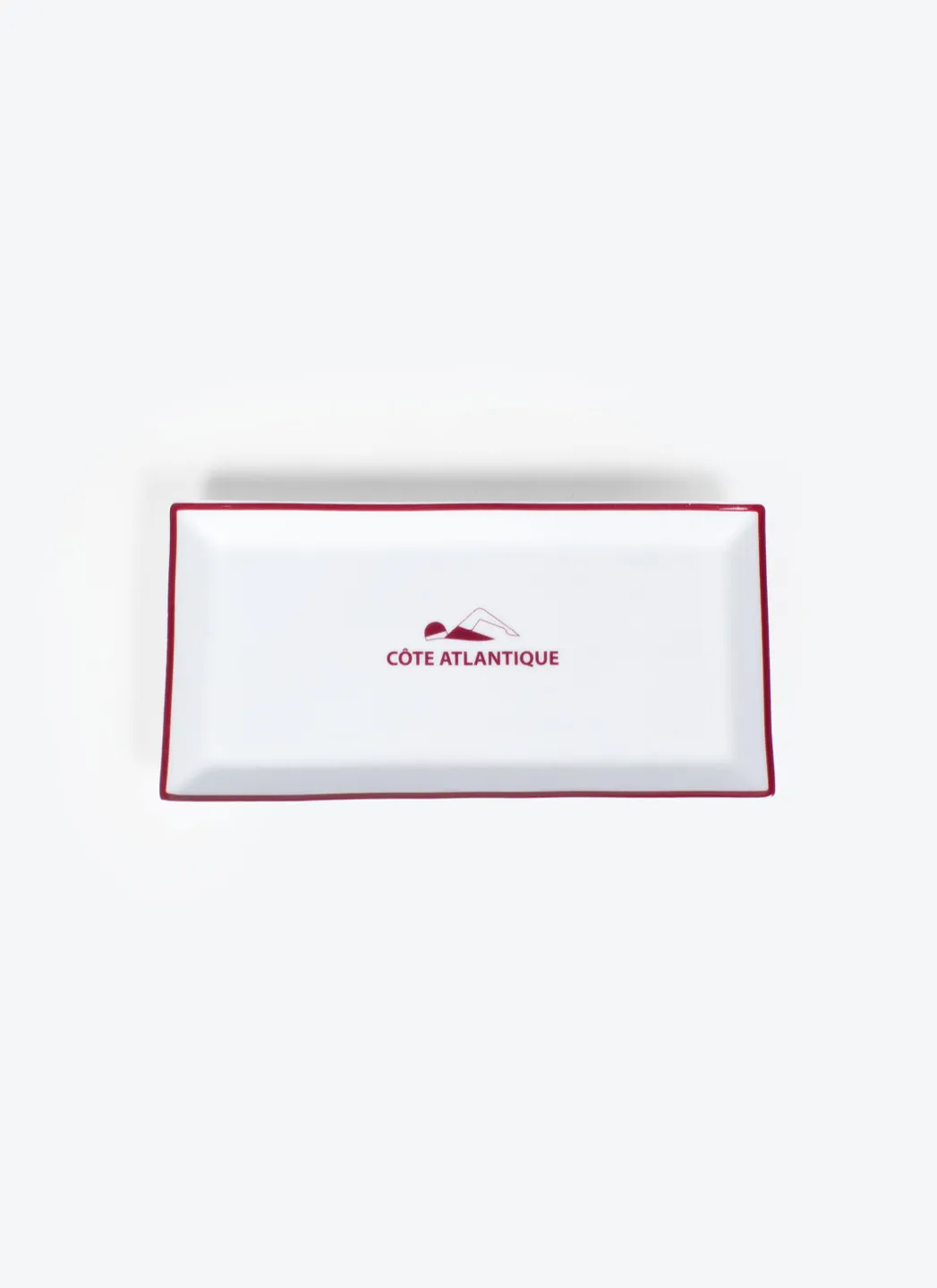 Plat à cake petit modèle en porcelaine blanche avec une impression rouge « Côte Atlantique » fabriqué au Portugal dans la région de Porto. Un accessoire indispensable pour votre table.