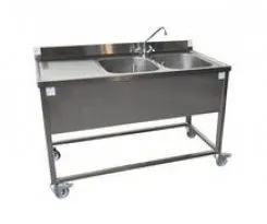 Double plonge en inox sur roulettes, deux cuves avec égouttoir et robinetterie. Cet évier en inox est ce qu’il vous faut pour faire la vaisselle sur les lieux de votre événement. Il possède un système d’alimentation et de vidange. Il est constitué de deux bac et d’un égouttoir pour plus d’efficacité. Il est facile à déplacer grâce à ses 4 roulettes munies de freins.