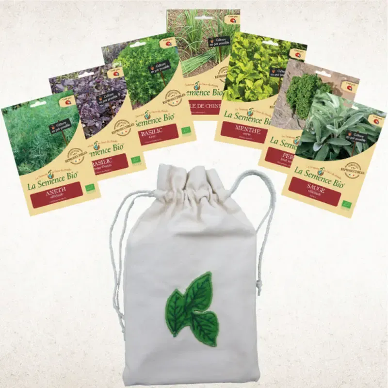 Le pochon Mmm ça sent bon ! contient 7 sachets de graines d’aromatiques 100% bio et reproductibles qui produiront des quantités de feuilles à utiliser.