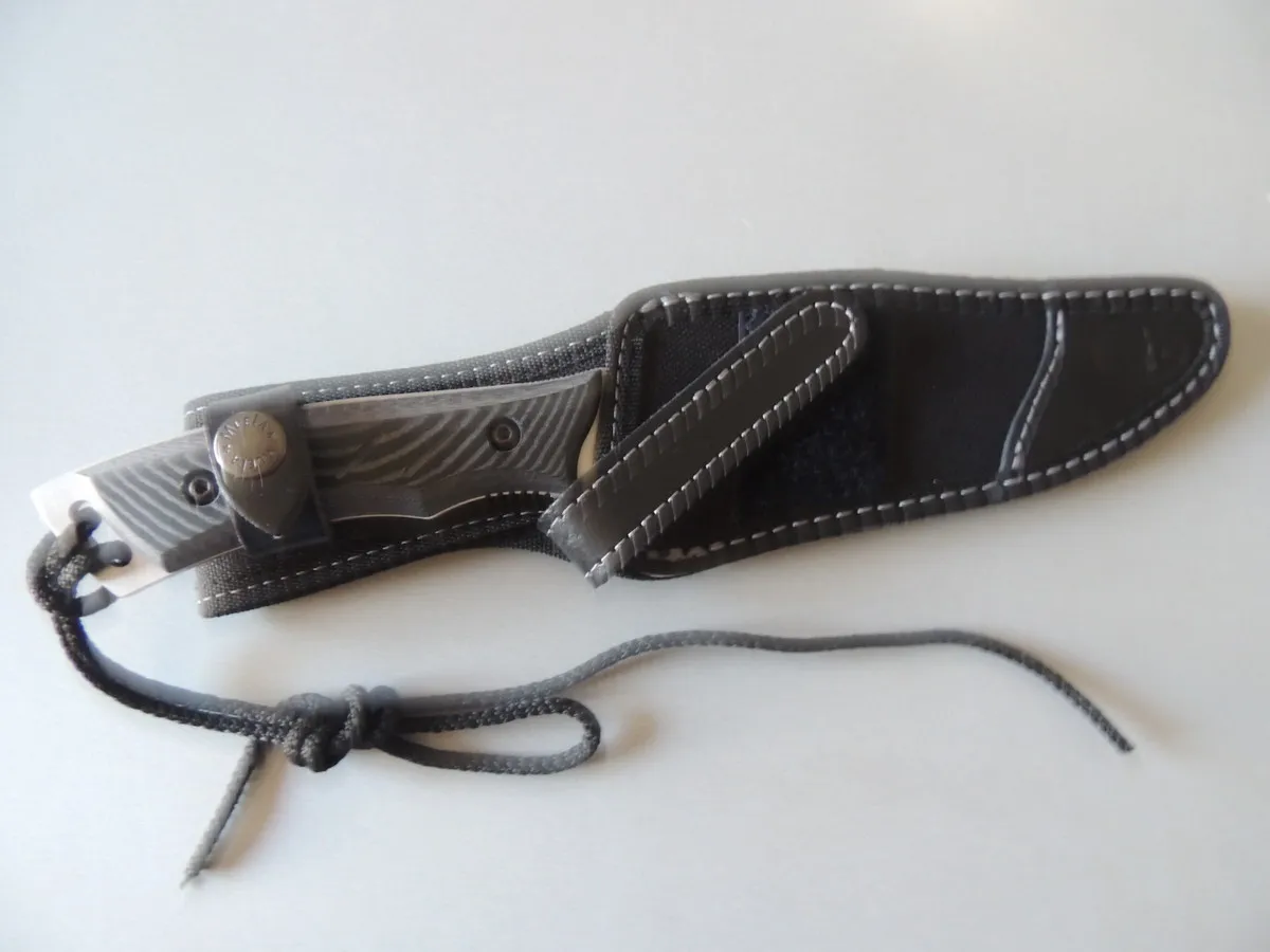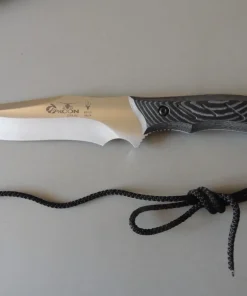 Son manche est en micarta gris veiné. Matériau composite à base de papier ou de coton mélangé avec de la résine. Le micarta assure une excellente robustesse au manche, une très bonne ergonomie.