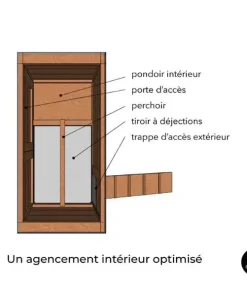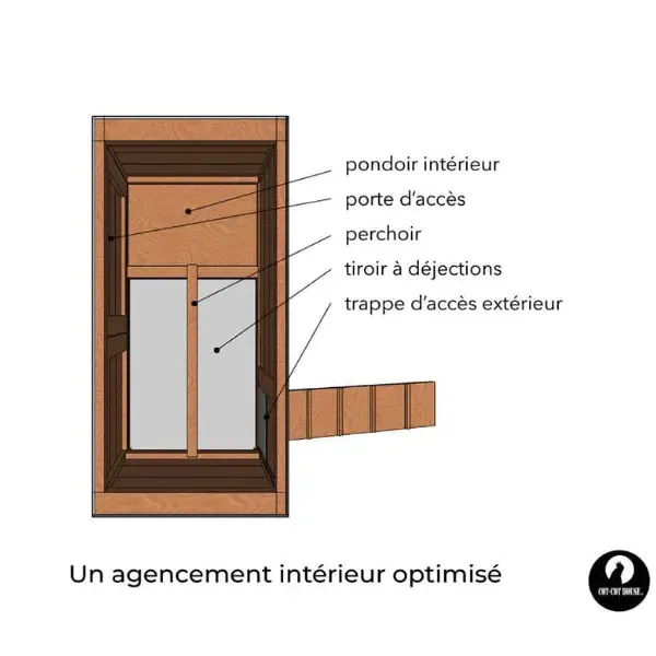 Sa capacité permet d’accueillir 2 poules pondeuses ou 3 poules naines. Il comprend les équipements suivants :
