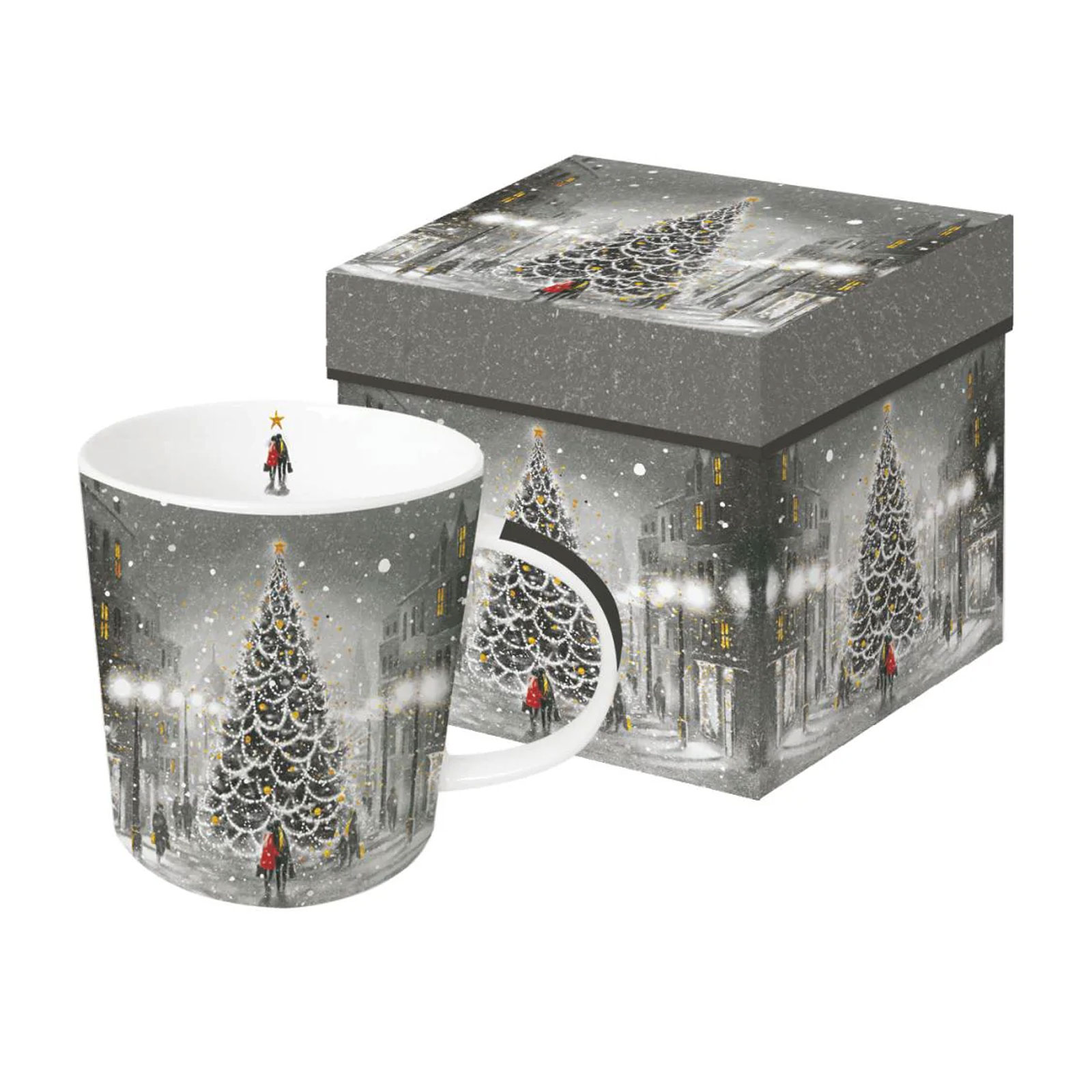 Tasse en porcelaine avec un village de Noël, vendue dans une boîte cadeau carrée assortie.