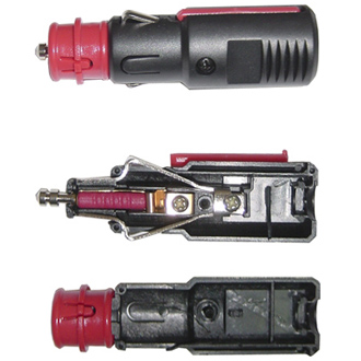 Fiche allume-cigare mâle avec fusible de 8 A en 24V. Fixation du câble en chicanée, connexion à vis jusqu’à environs 2 mm de section de câble.