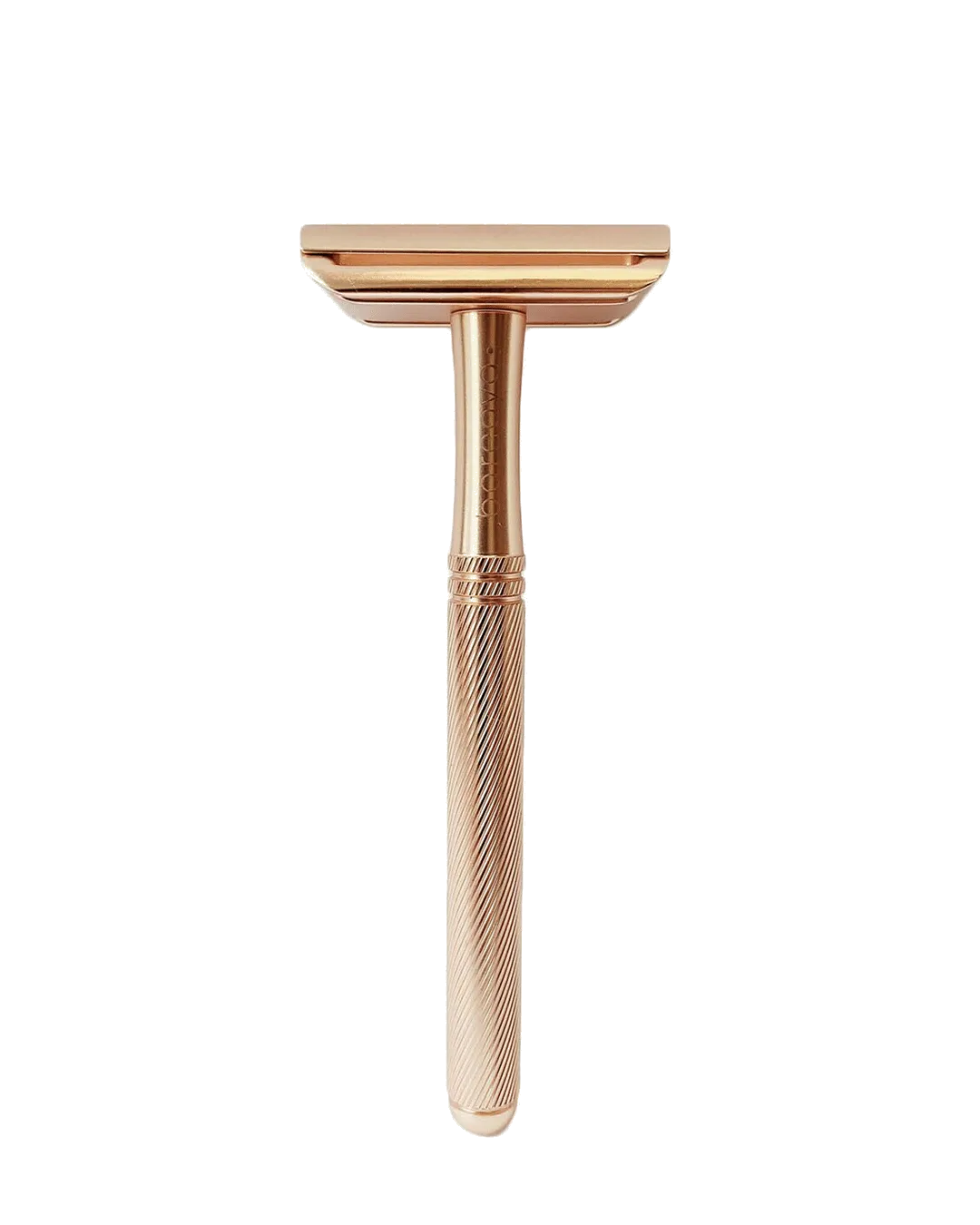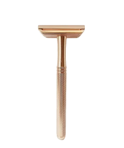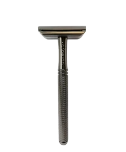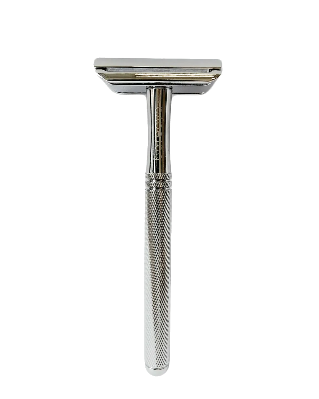 Dévissez le manche dans le sens contraire des aiguilles d’une montre. La lame s’insère entre les deux parties formant la tête. Mise en place, la lame est incurvée, cela permet un rasage moins agressif.