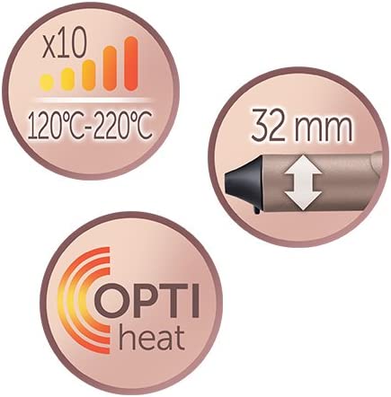 * Fonction Pro+ – grâce à la fonction de réglage PRO+ spécialement conçue, le fer à friser est automatiquement réglé sur 185°C. Cela signifie que vous pouvez boucler vos cheveux plus souvent sans vous soucier de leur santé et rester magnifiquement bouclés toute la journée * Spécifications du fer à friser : la technologie intelligente OPTIheat fournit de la chaleur là où elle est nécessaire * Des résultats dignes d’un salon qui durent toute la journée * 32 mm de large et 125 mm de long surface de curling pour créer des vagues volumineuses et élégantes * Surface rugueuse Grip tech – surface antidérapante pour un style confortable * Affichage numérique intégré,