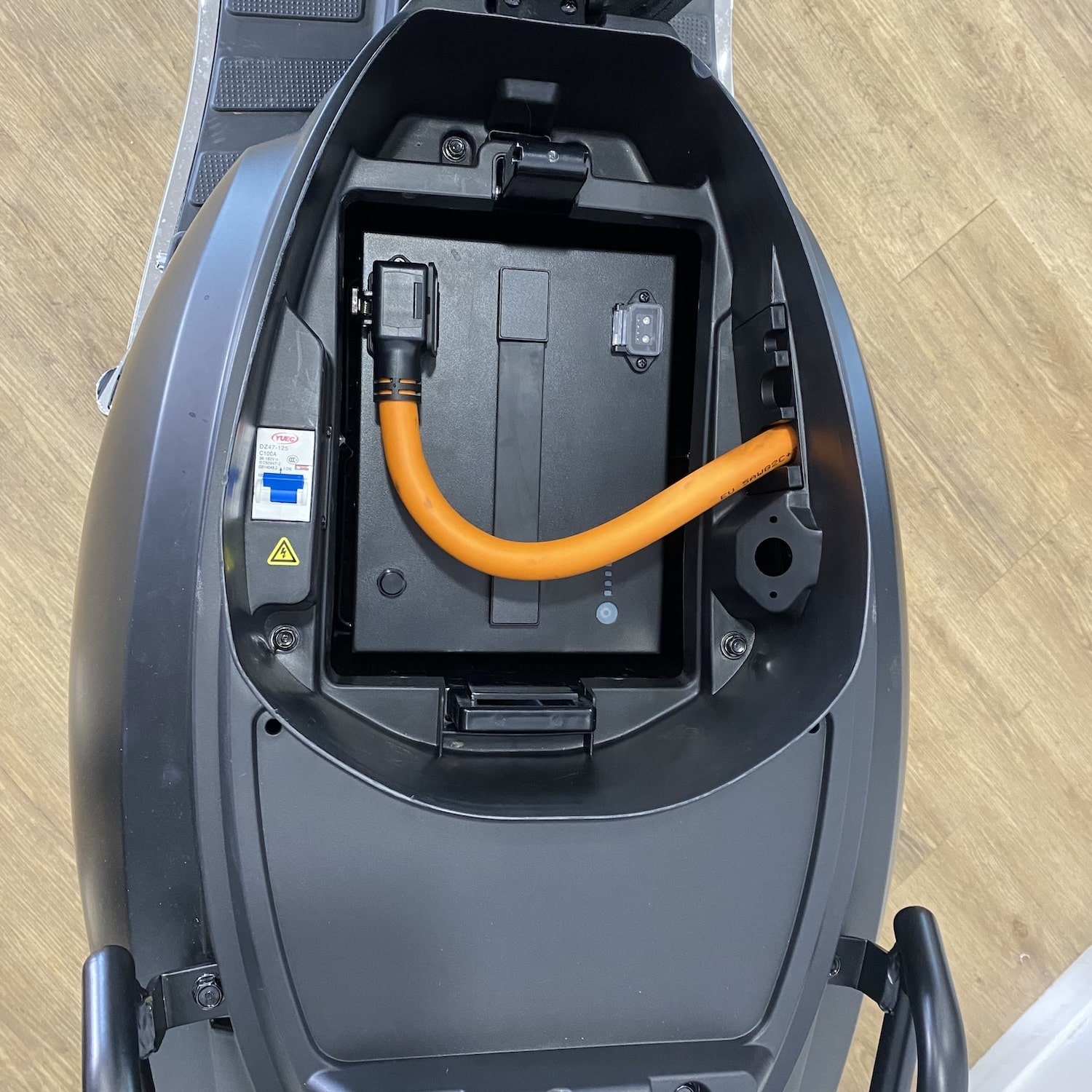 Assez lourde du fait sa large capacité (environ 20 kg), elle présente néanmoins l’avantage d’être facilement extractible. Un port de charge externe permet de charger sans extraire la batterie.