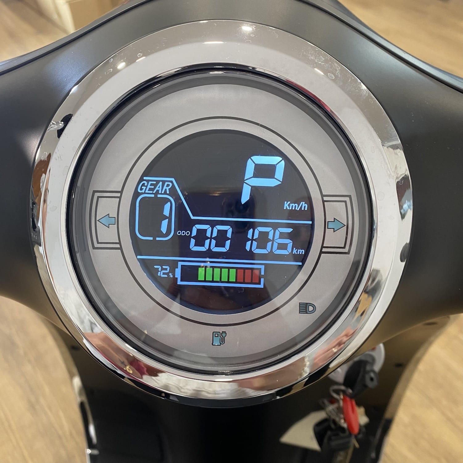 Le compteur digital indique la vitesse instantanée, le niveau de batterie restant et un odomètre. Ce compteur est parfaitement lisible et clair. Selon arrivage, il peut être en noir et blanc, ou en couleur. Ils présentent tout deux les mêmes informations. Enfin, le Rider 3000W dispose d’un démarrage sans clé.