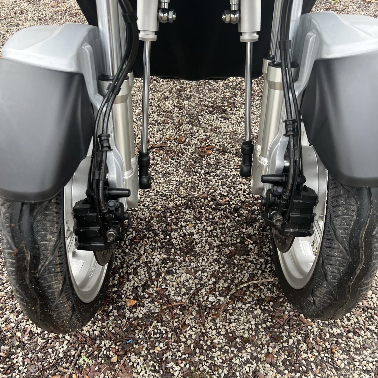 À l’arrêt ou en marche, la stabilité du Rider 3RS+ est remarquable. Le train avant et ses deux roues embarquent une technologie gyroscopique. En d’autres termes, ses deux roues avant sont coordonnées électroniquement et mécaniquement tout en étant indépendantes l’une de l’autre. Assurant confort autant que sécurité, elles sont capables de monter ou de descendre des trous, trottoirs, etc. d’une hauteur maximale de 20 cm. Ceci, roue gauche et droite, indépendamment. Ce train avant est aussi étonnamment léger à la conduite. D’excellents scooters trois roues thermiques, tel le Piaggio MP3 ou le Peugeot Metropolis voient leur train avant bien plus lourd que celui du Rider 3RS+. Ainsi, tourner se fait très facilement et son rayon de braquage est aussi très bon.
