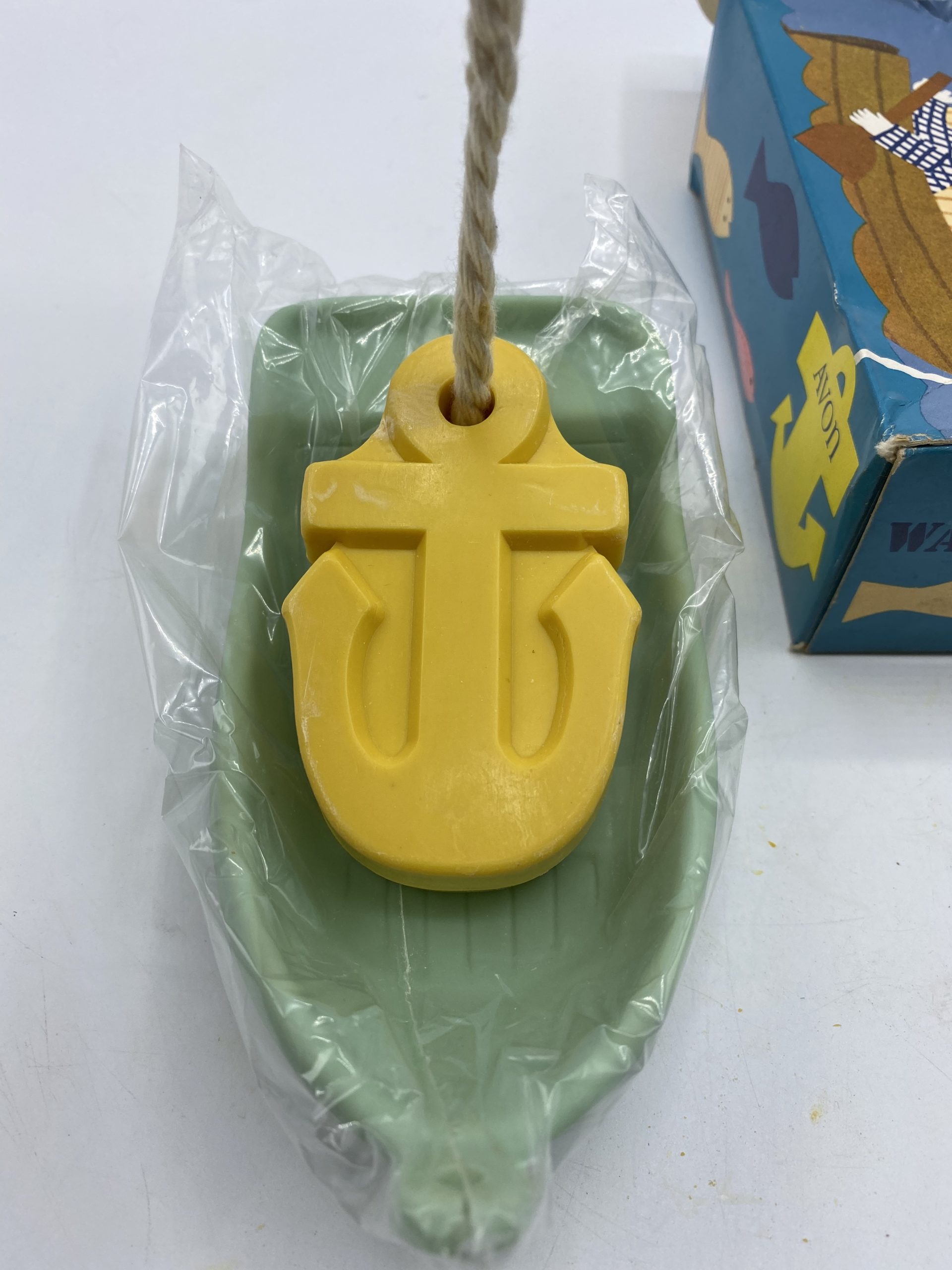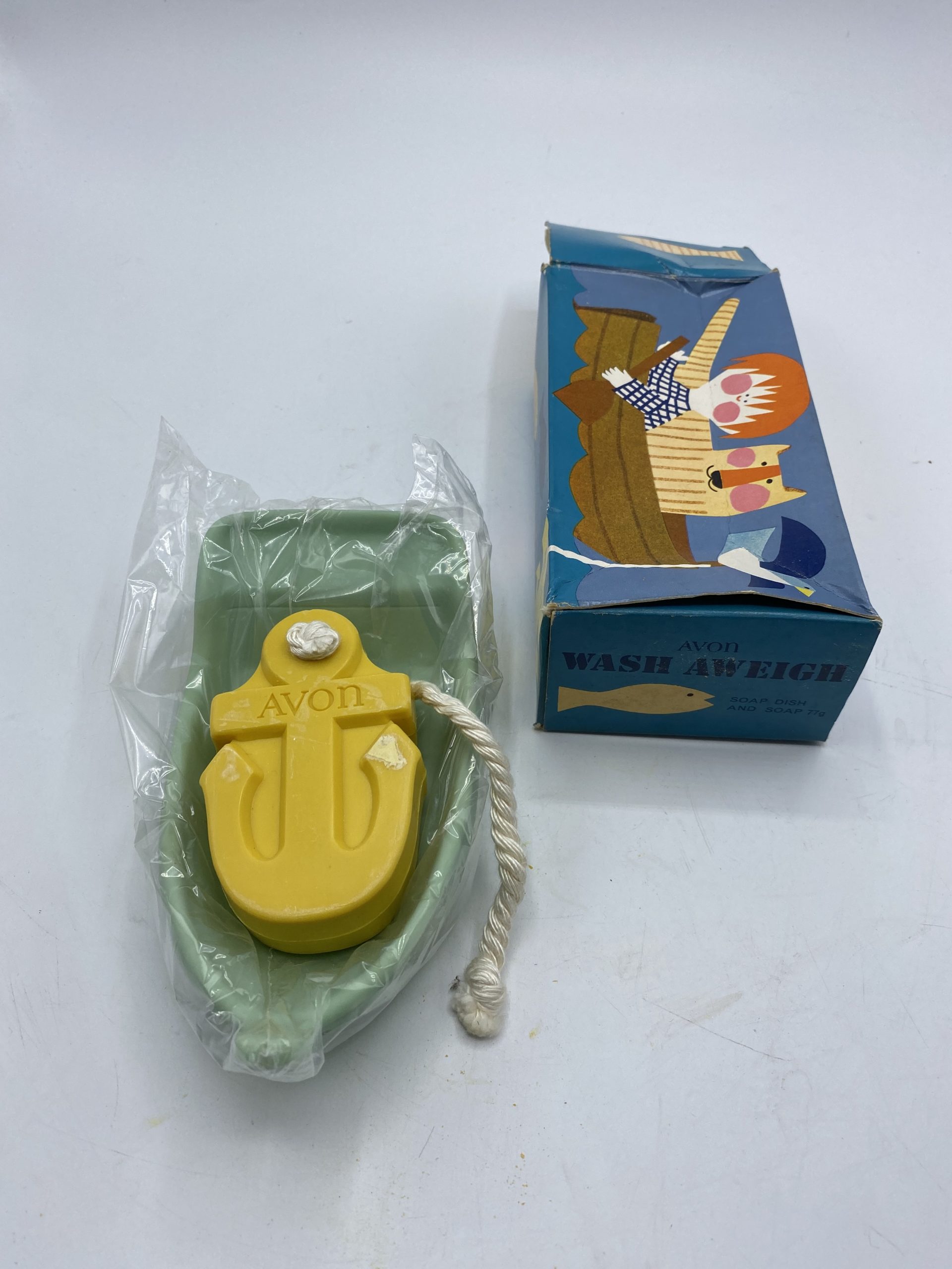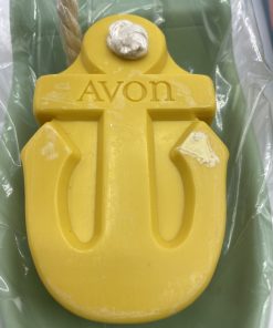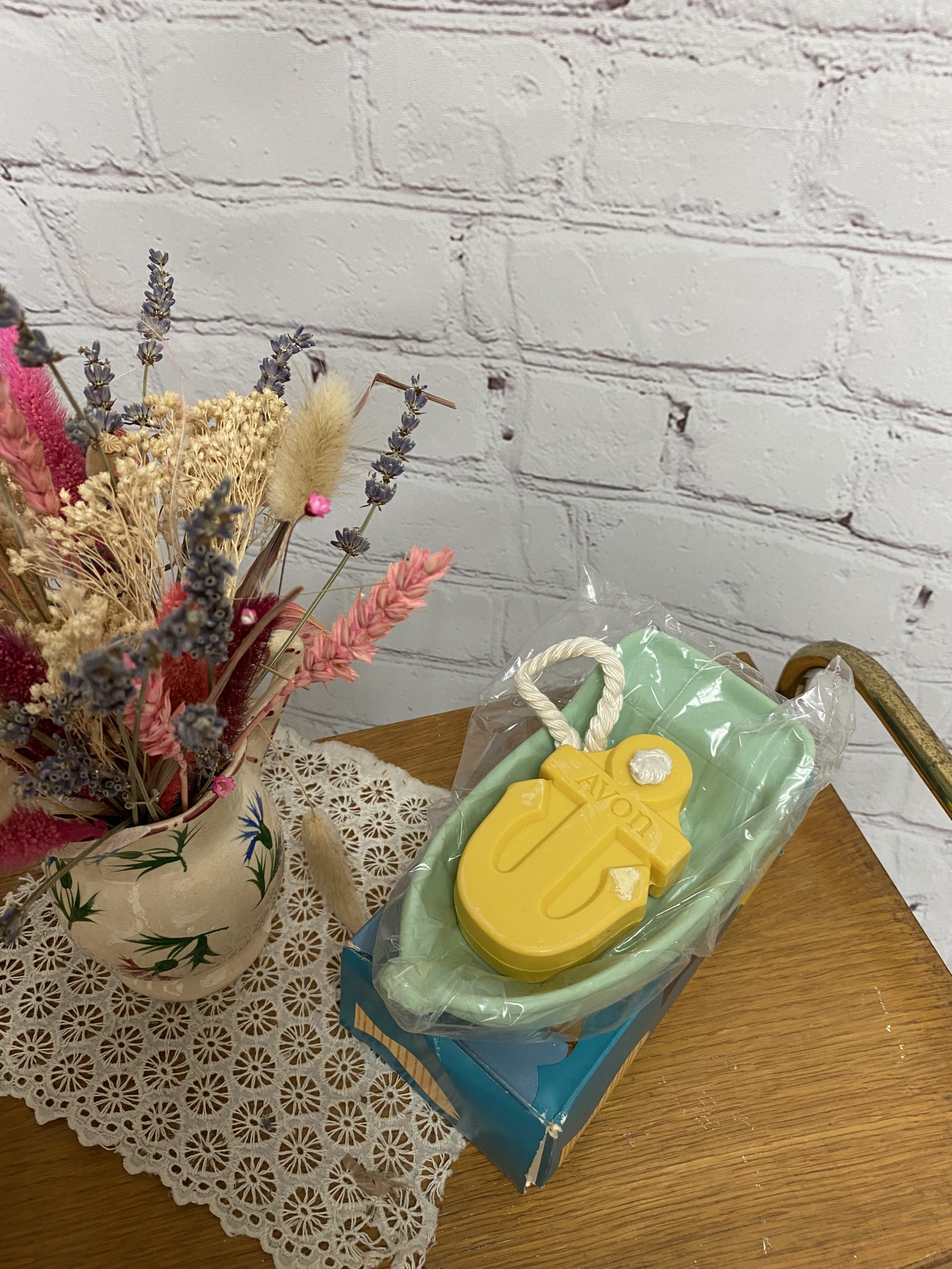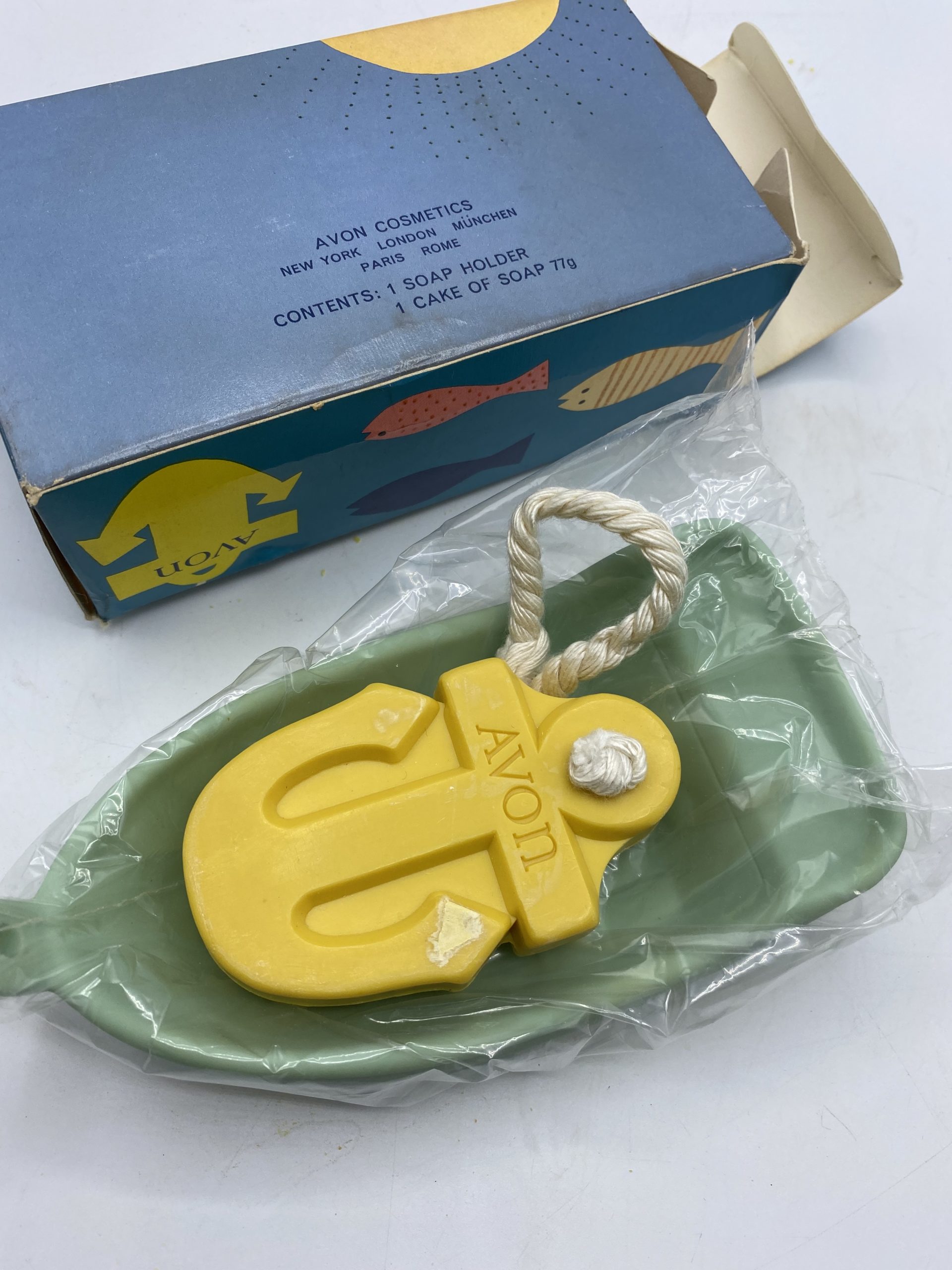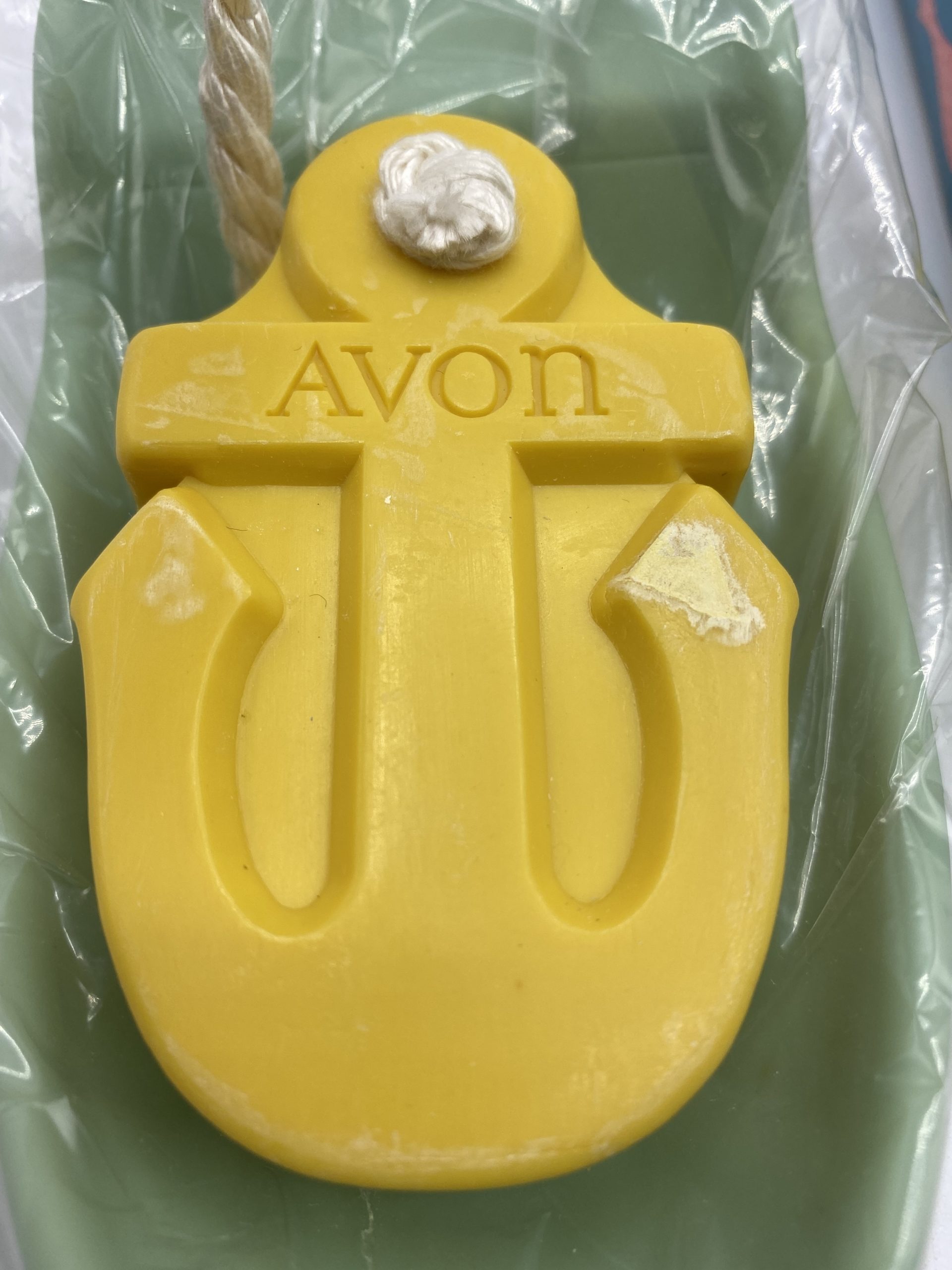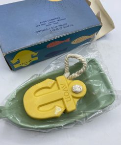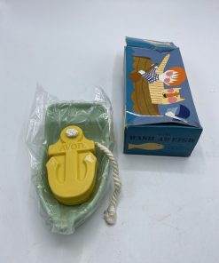 On craque d’amour pour ce joli petit savon ! De la marque de cosmétique Avon, ce savon vintage est en forme d’ancre de couleur jaune. Attaché à une corde, il peut s’accrocher pour être suspendu. Vintage, le savon présente quelques traces d’usure et des coups (cf photos) et il est emballé dans sa boîte d’origine avec sa petite coupelles pour le poser dessus en forme de petite barque en plastique de oculeur vert d’eau. Le savon fait partie de la collection «Wash aweigh». On adore !