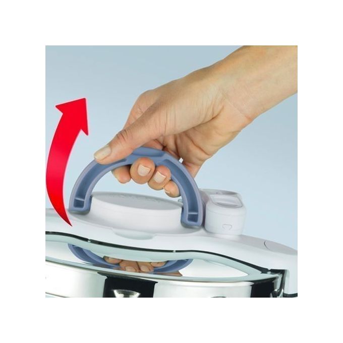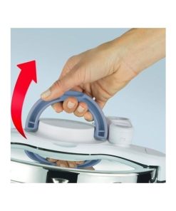 Une seule main suffit ! L’autocuiseur Seb Clipso Minut ‘Perfect est simple, pratique et élégant avec ses poignées de couleur bleue.