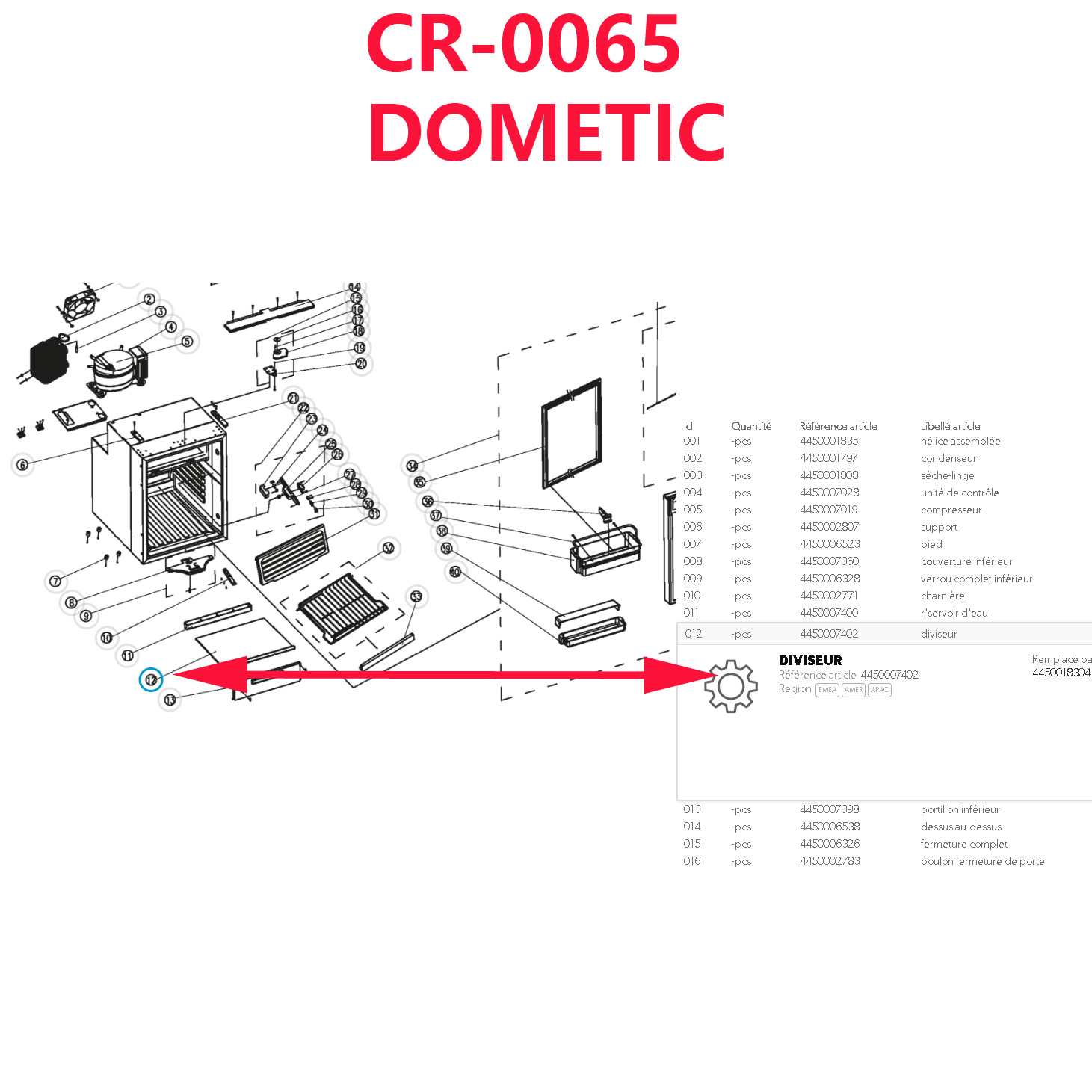 Pour vérifier si votre réfrigérateur comporte bien cette pièce, merci de nous contacter et munissez vous pour vérifier la compatibilité de votre numéro de produit de votre appareil Dometic (qui se trouve sur l’étiquette signalétique).