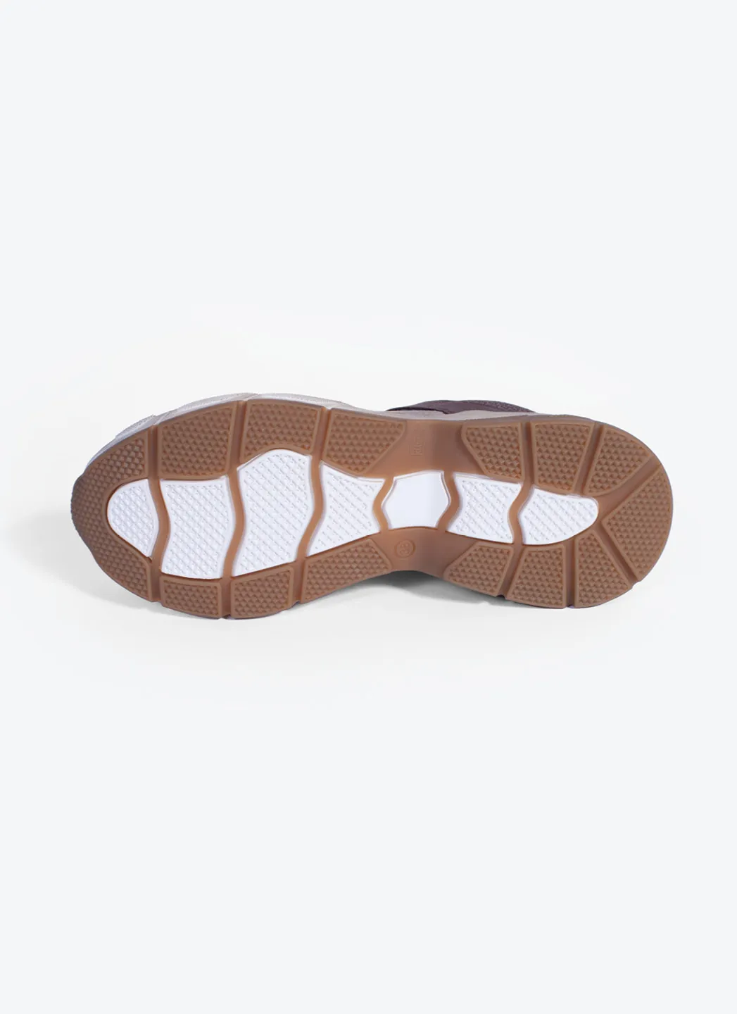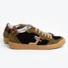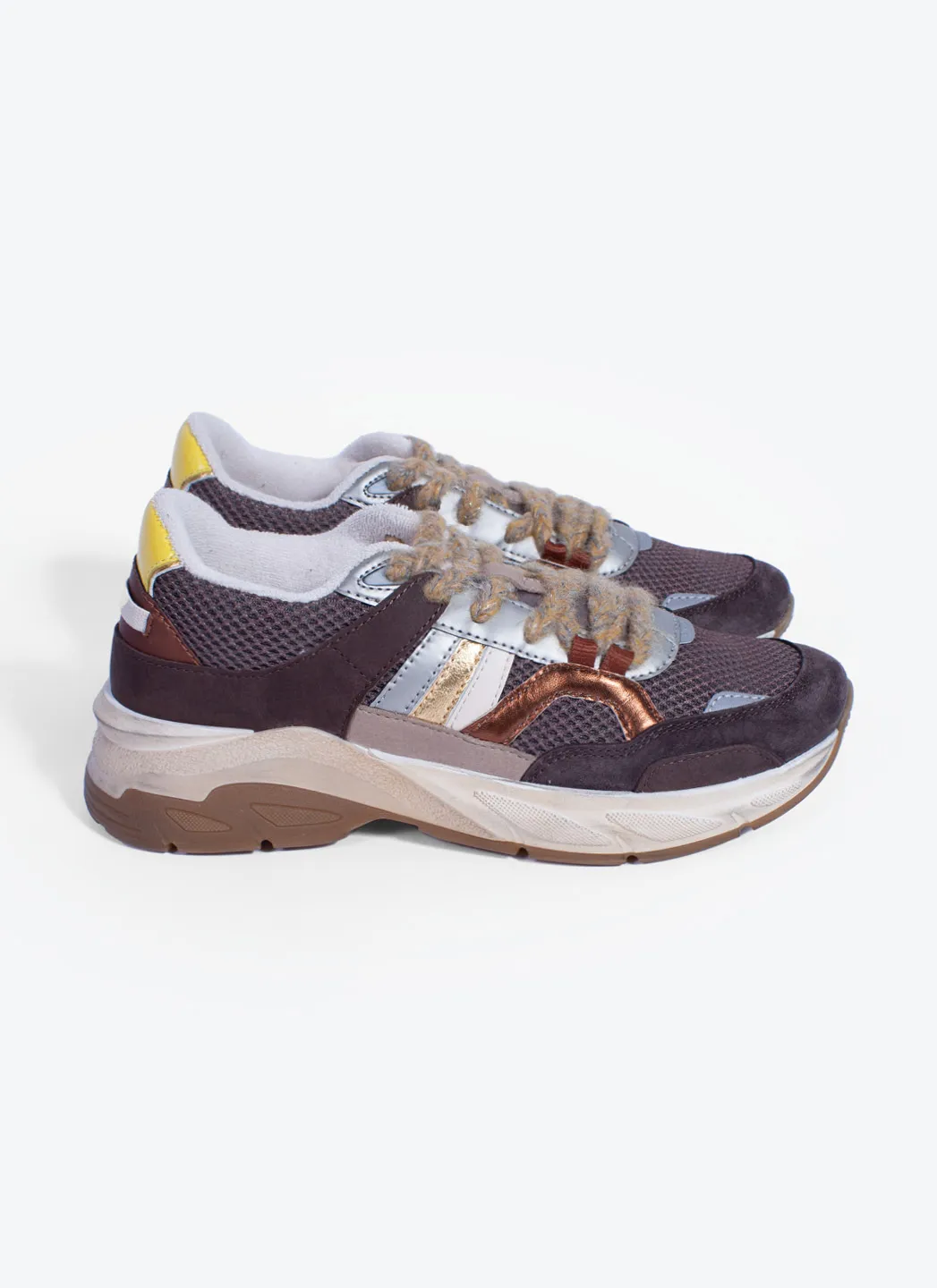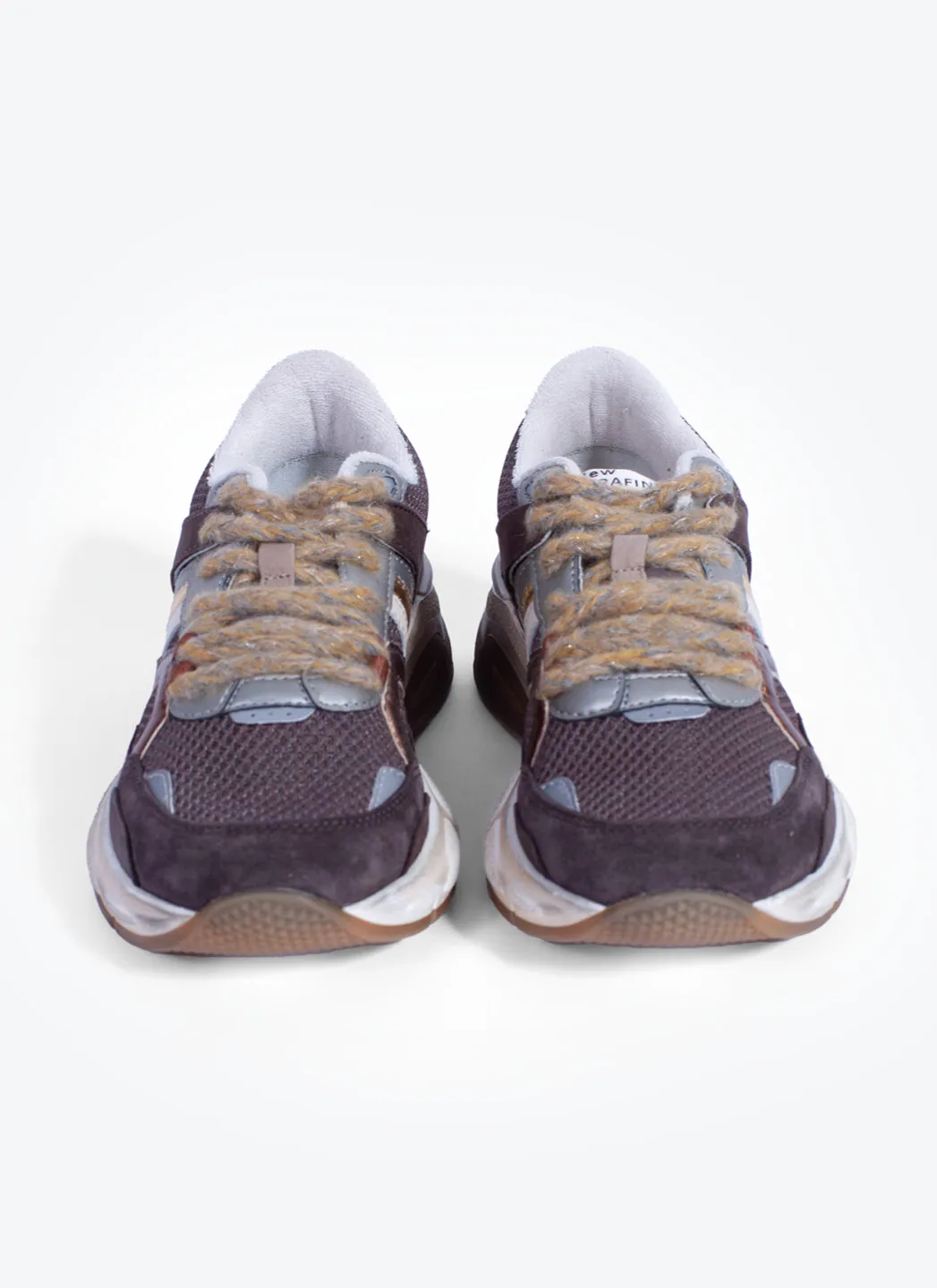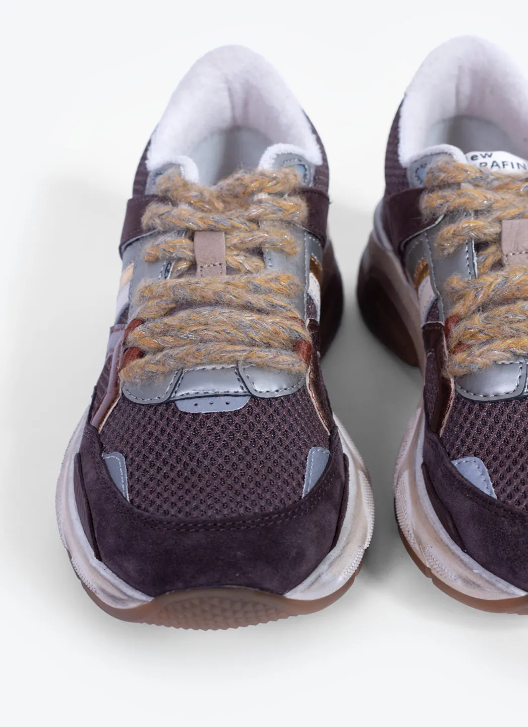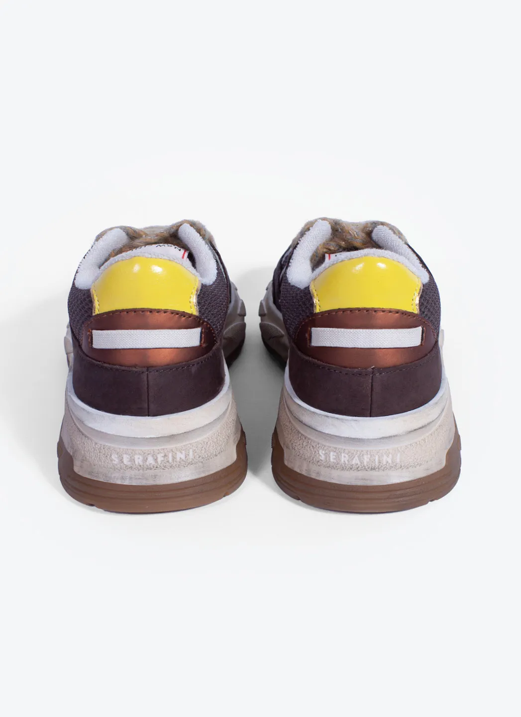 Le modèle Vibe de la marque italienne Serafini est une basket trapue au design patchwork en maille, cuir et daim. Cette chaussure se distingue par sa semelle surdimensionnée, ses lacets en fourrure et son talon jaune. Très confortable et d’une qualité irréprochable.