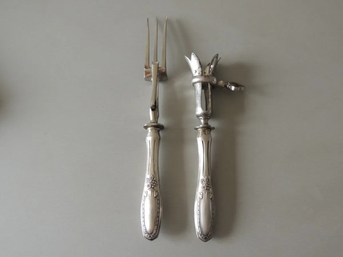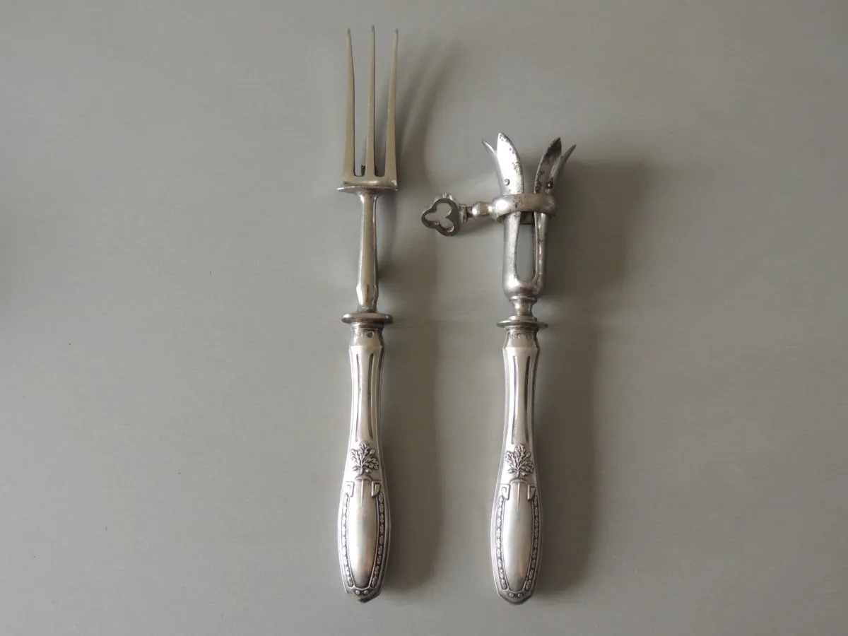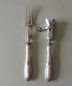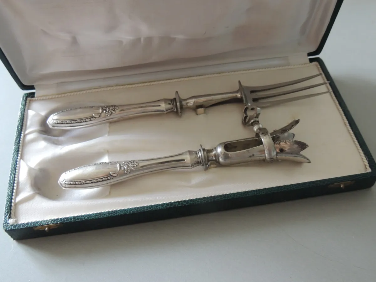 Avec écrin. Fourchette 26 cm et pied à gigot 20 cm.