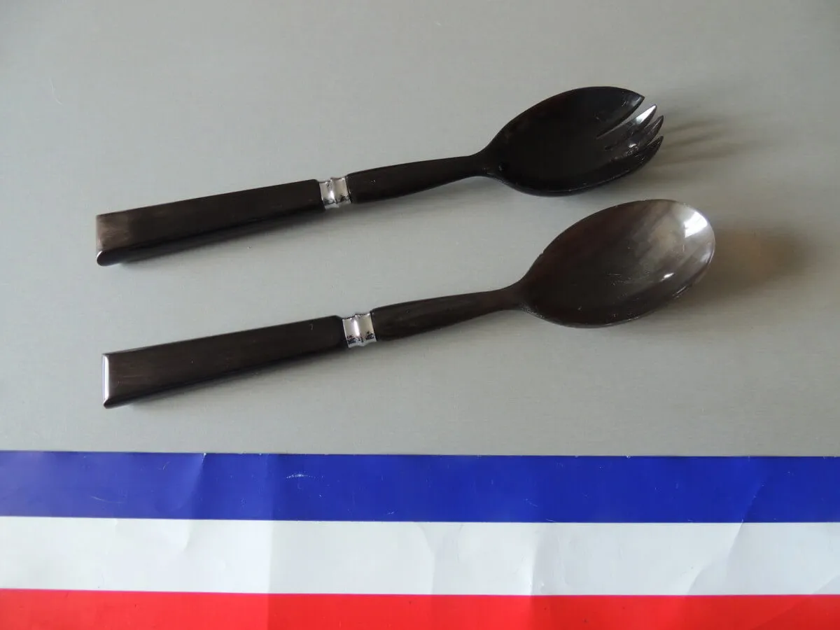 Service à salade 2 pièces en corne de buffle et argent 26 cm.