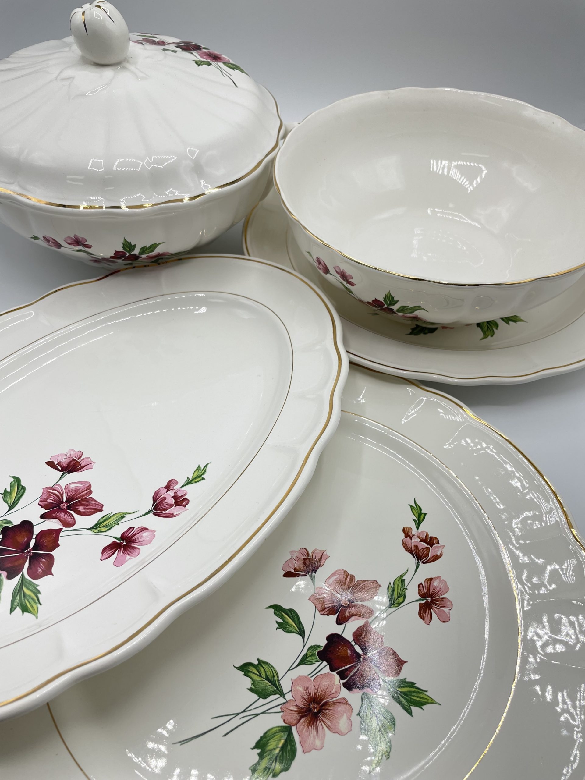 Magnifique service en faïence blanche de Briare estampillé Salins. Ce service est composé d’1 soupière, d’1 saladier, d’1 assiette de présentation, d’1 plat creux et d’1 plat ovale. Ce service élégant et joliment décoré d’un liseré doré et de motifs de fleurs des champs roses et violettes qui donne à ce service un esprit champêtre chic. Idéal pour recevoir vos invités dans les règles de l’art en mettant le petits plats dans les grands !