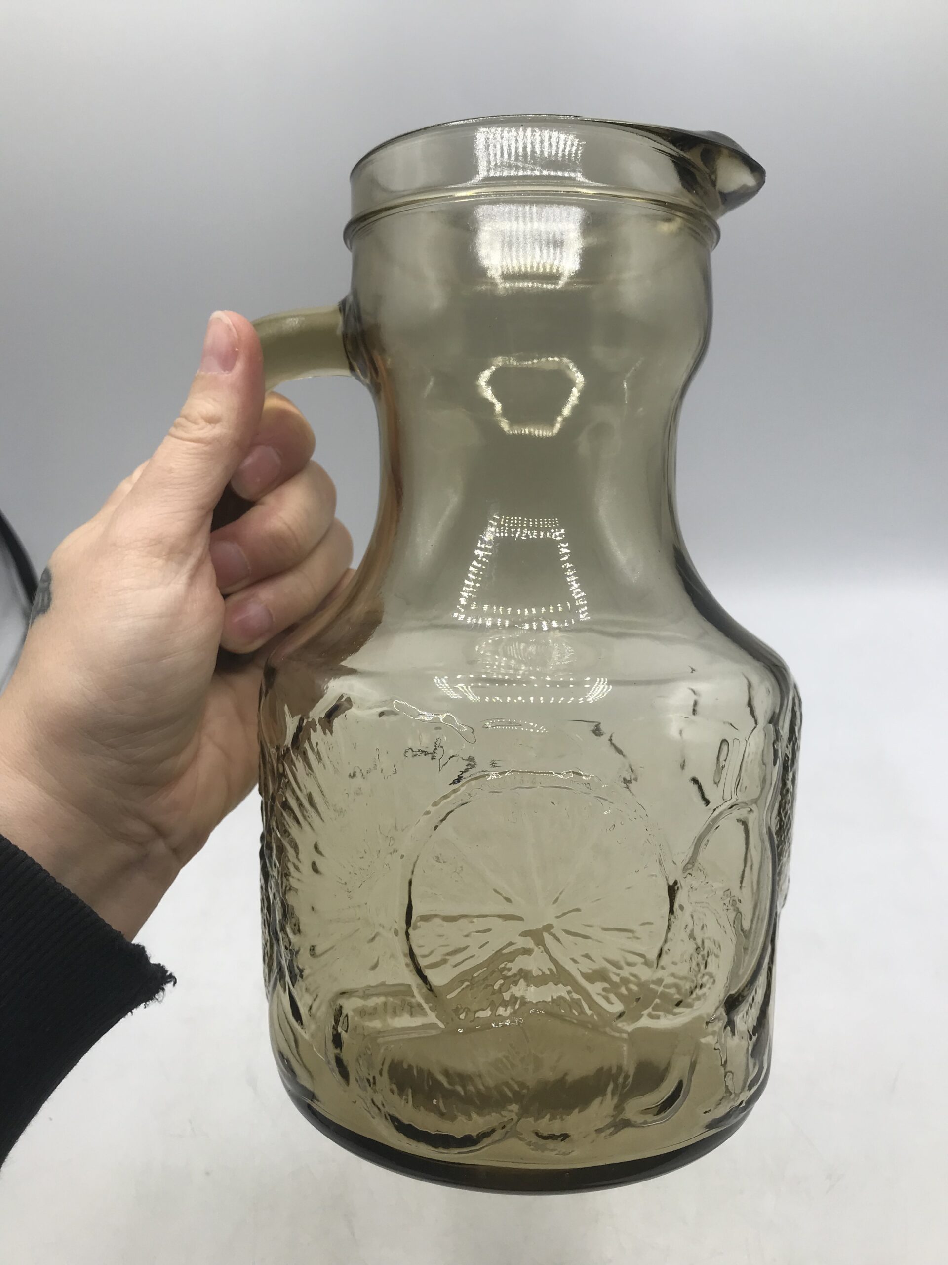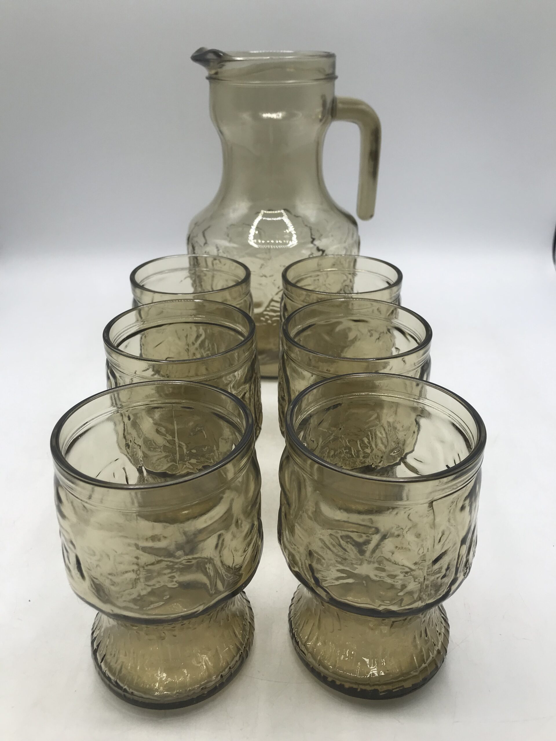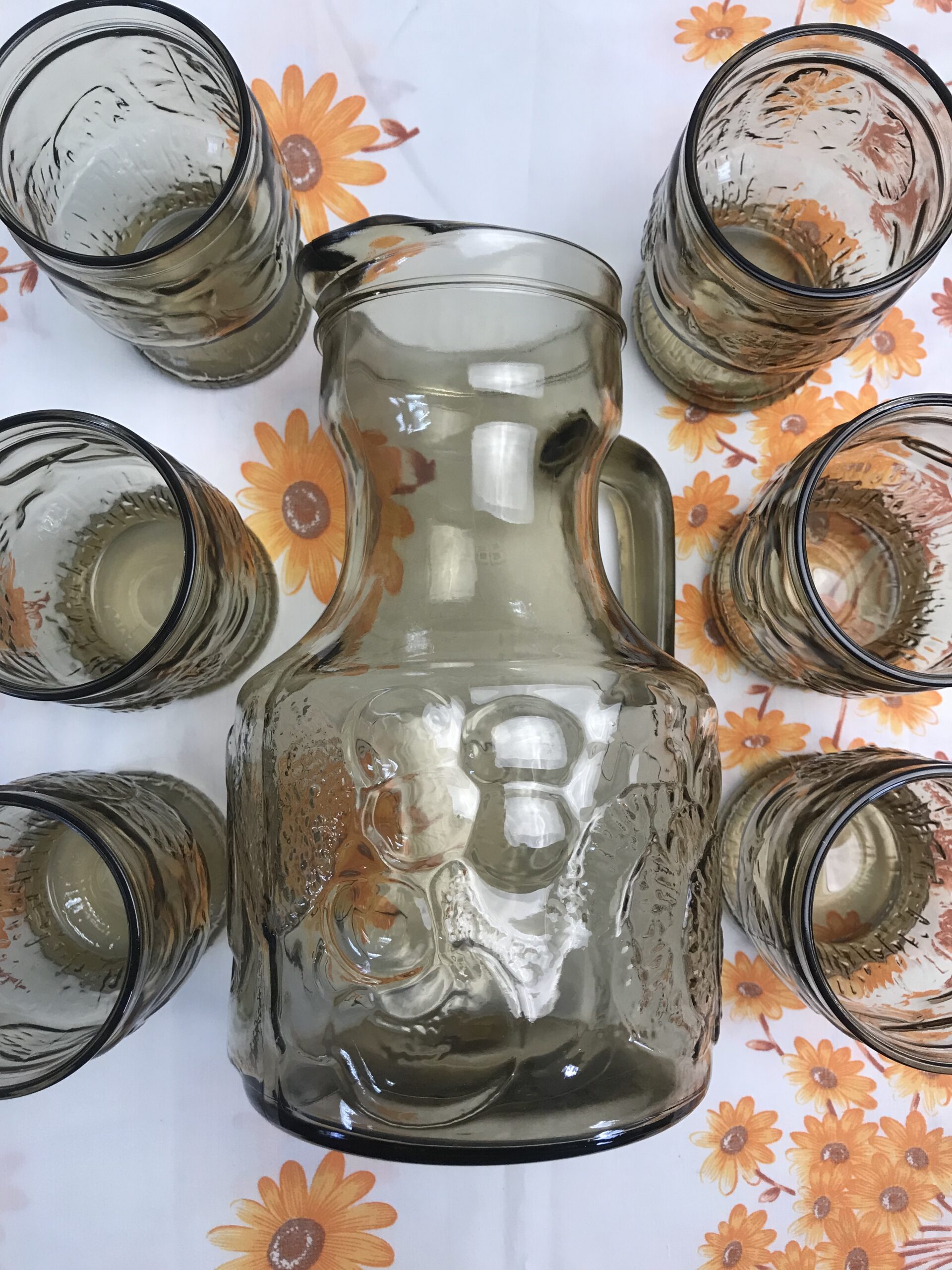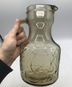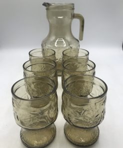 Service orangeade beige vintage. Bel ensemble, ce service est composé de 6 verres et d’un grand pichet. Il est en verre de couleur légèrement fumé ce qui lui donne une note vintage. Le pichet a un diamètre de 12,5 cm pour une hauteur de 23 cm. Les verres sont au nombre de 6, ils ont un diamètre de 7 cm pour une hauteur de 11 cm. Le tout est en parfait état, Made in Italy ce service a été fait avec gout. Les verres ont une forme parfaitement étudiée pour une prise ne main facile. Le service est décoré de fruits divers gravés dans le verre. Un bel ensemble pour venir embellir vos tables d’été. Le charme du vintage.