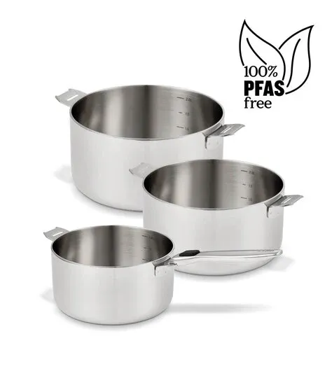 Set de 3 casseroles inox sans PFAS. Poignée amovible.