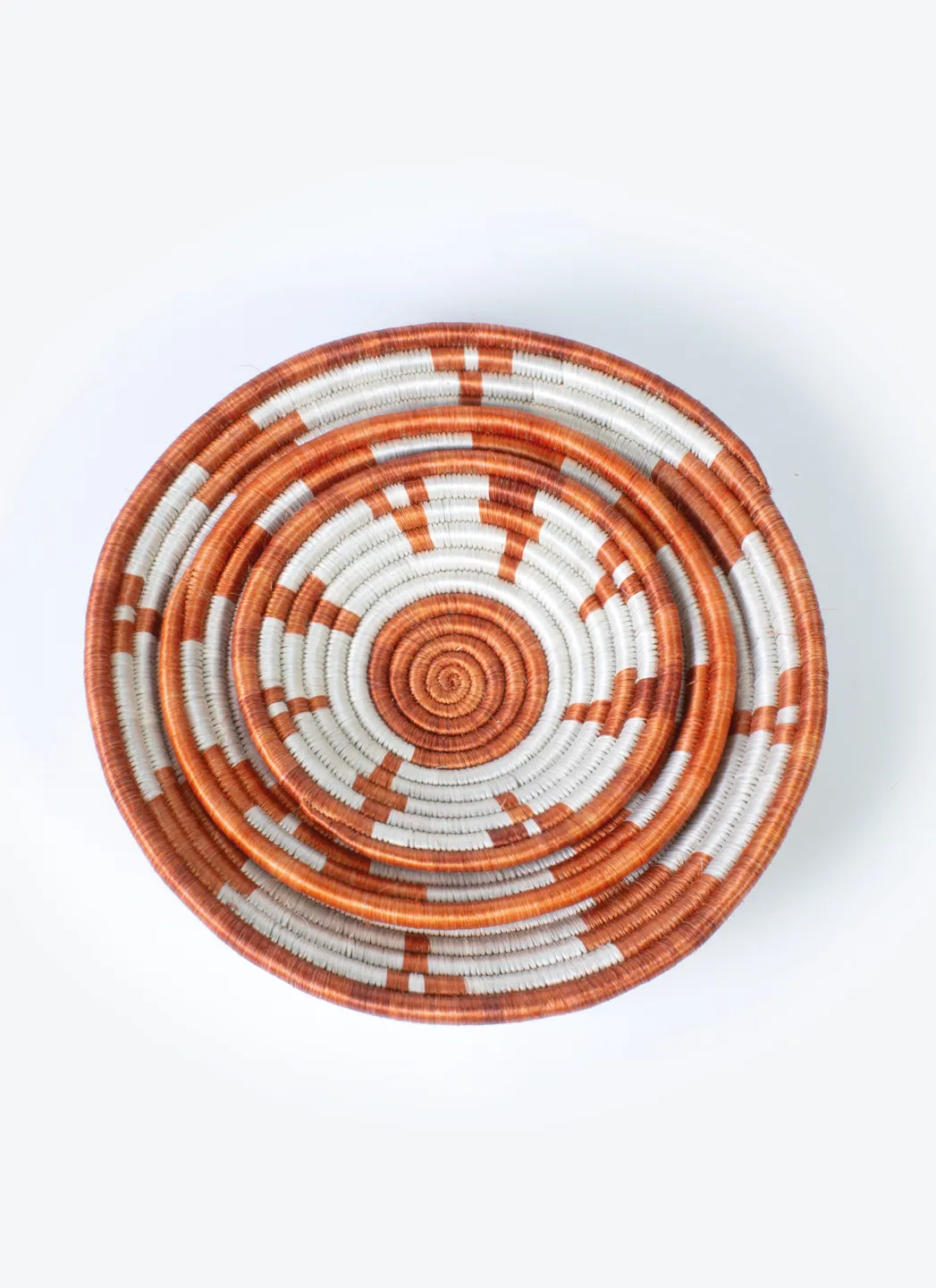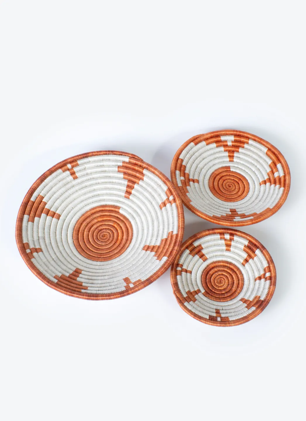 Ensemble de trois paniers tressés à la main au Rwanda. Parfait pour présenter des fruits ou pour organiser des petits objets dans la maison.