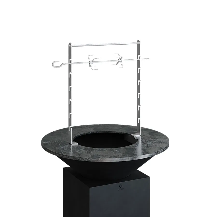 Set rôtissoire pour brasero Ofyr. Structure en acier inoxydable. Composé de 2 montants en inox, 2 tubes en inox (1 pour modèles 85 et 1 pour modèles 100), 1 broche avec crochet pivotant. 2 fourches de maintien de la viande et 1 crochet en S pour casserole.