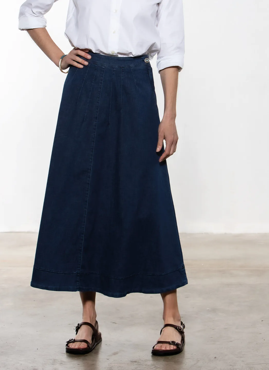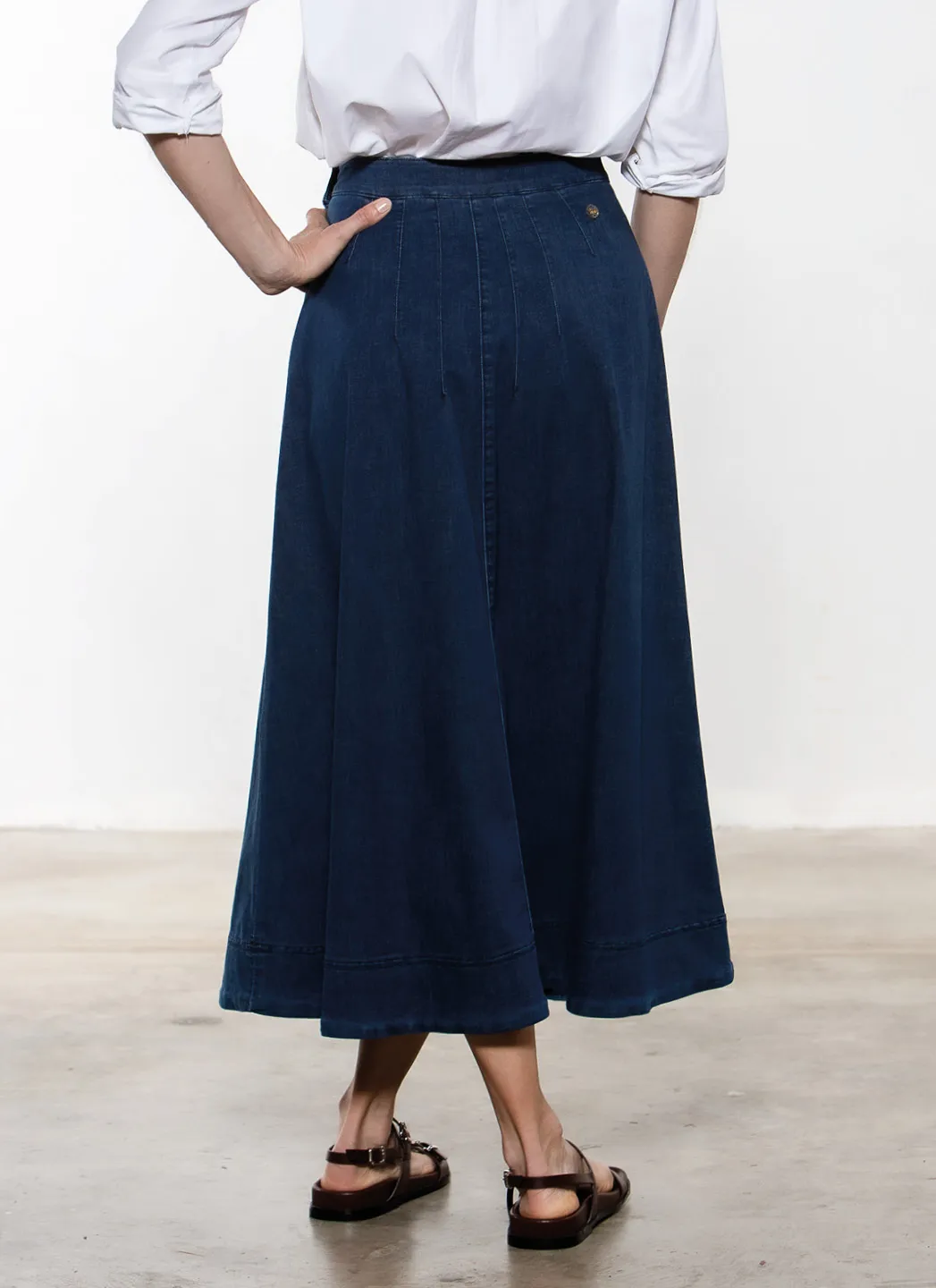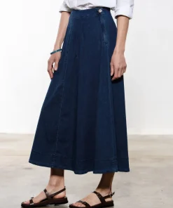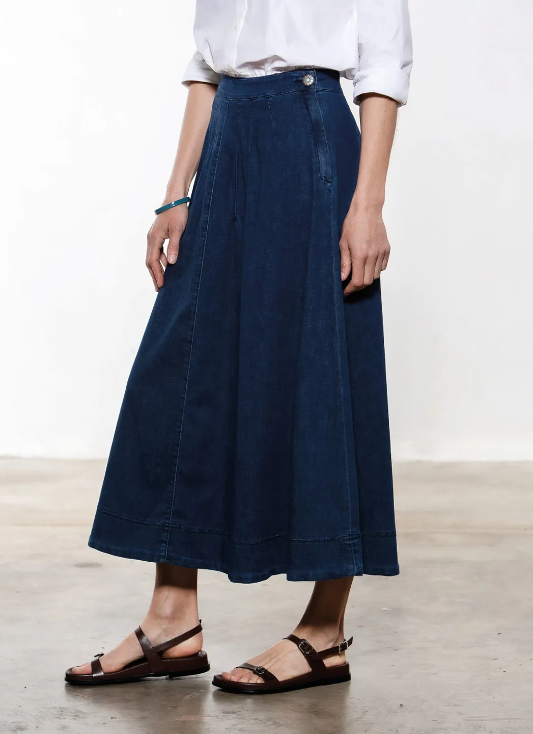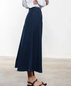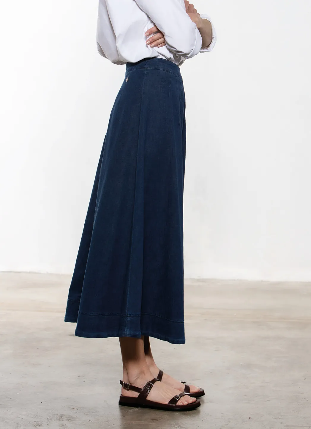 Superbe jupe en denim bleu foncé de chez Shaft. Elle est cintrée à la taille et évasée sur le bas. La sensation au toucher est très agréable et elle dispose d’une couture à la verticale au milieu tout au long de la jupe.