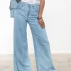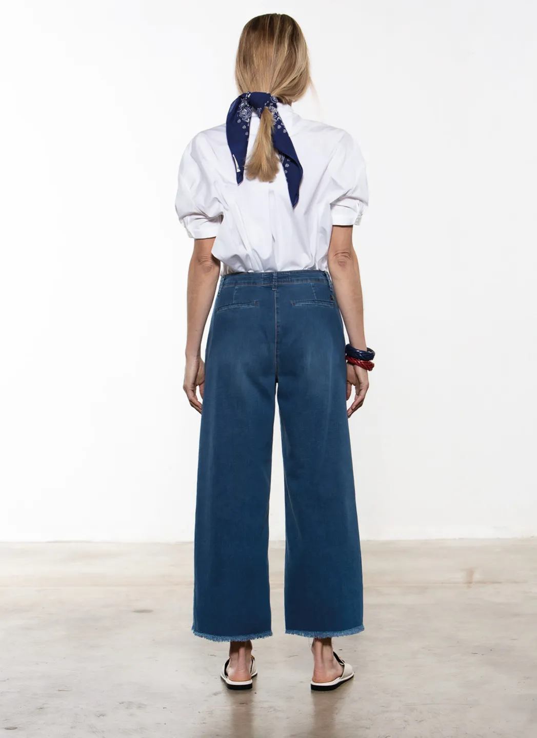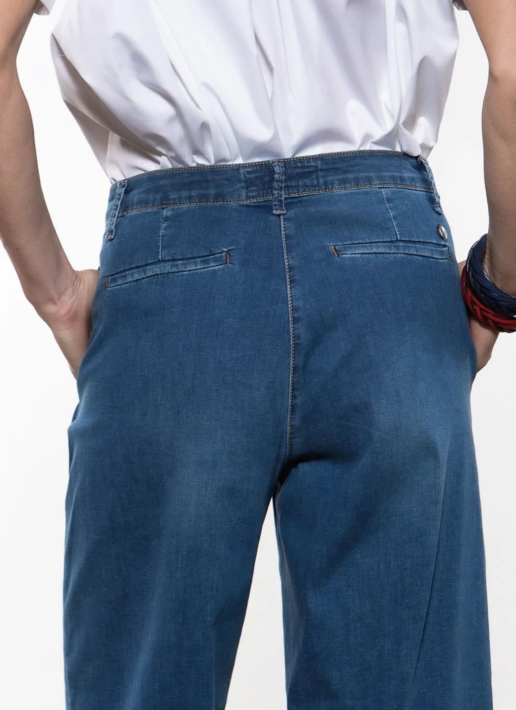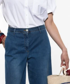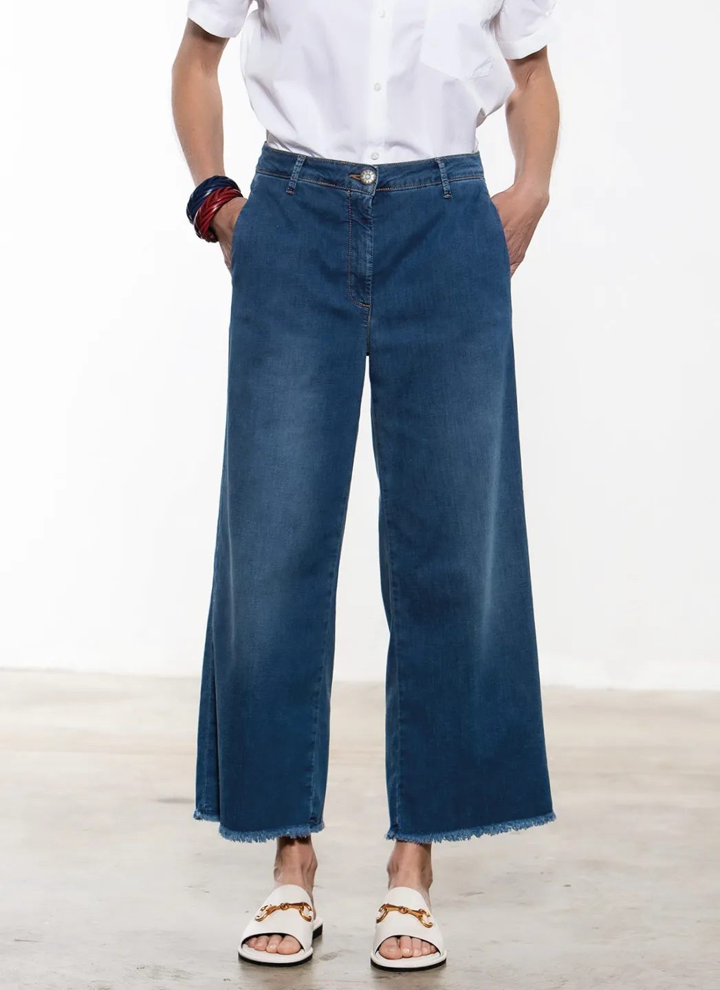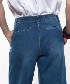 Jeans avec poches latérales en denim stretch. Coupe légèrement ample et longueur raccourcie avec le bas effiloché.