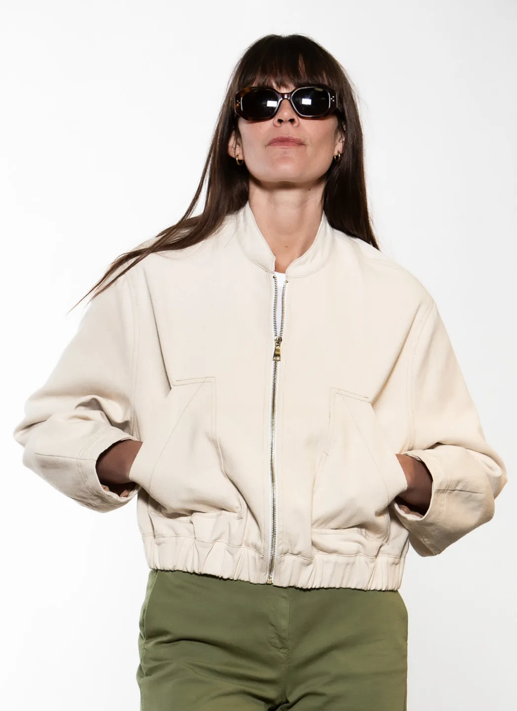 Superbe veste bombardier en denim avec ourlet élastique et coupe ample. Tissu doux et épais et deux poches latérales oversize. Le volume dans le dos et sur les épaules donne à cette veste un superbe drapé qui crée une silhouette intéressante.
