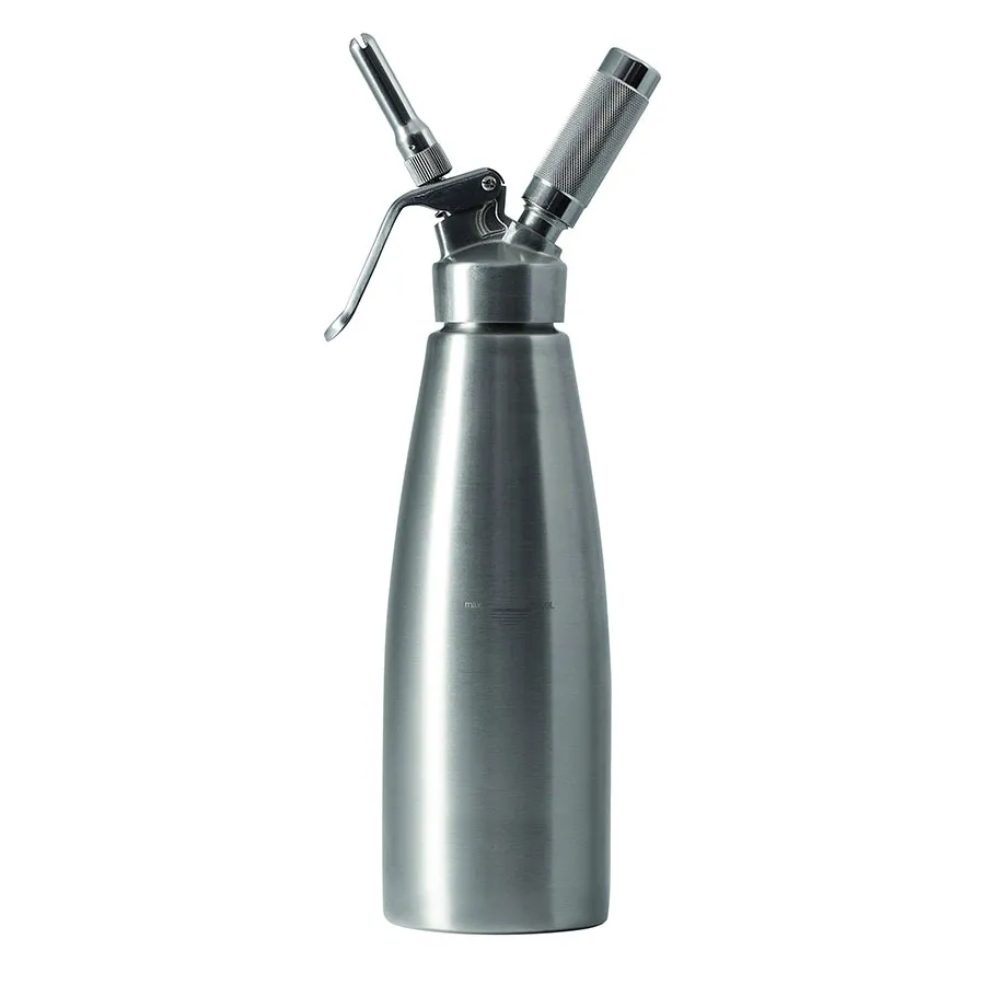 Siphon à crème capacité 1 litre. Construit en acier inoxydable. Livré avec 3 douilles et une brosse de nettoyage. Fonctionne avec des cartouches de protoxyde d’azote N20 (non incluses).