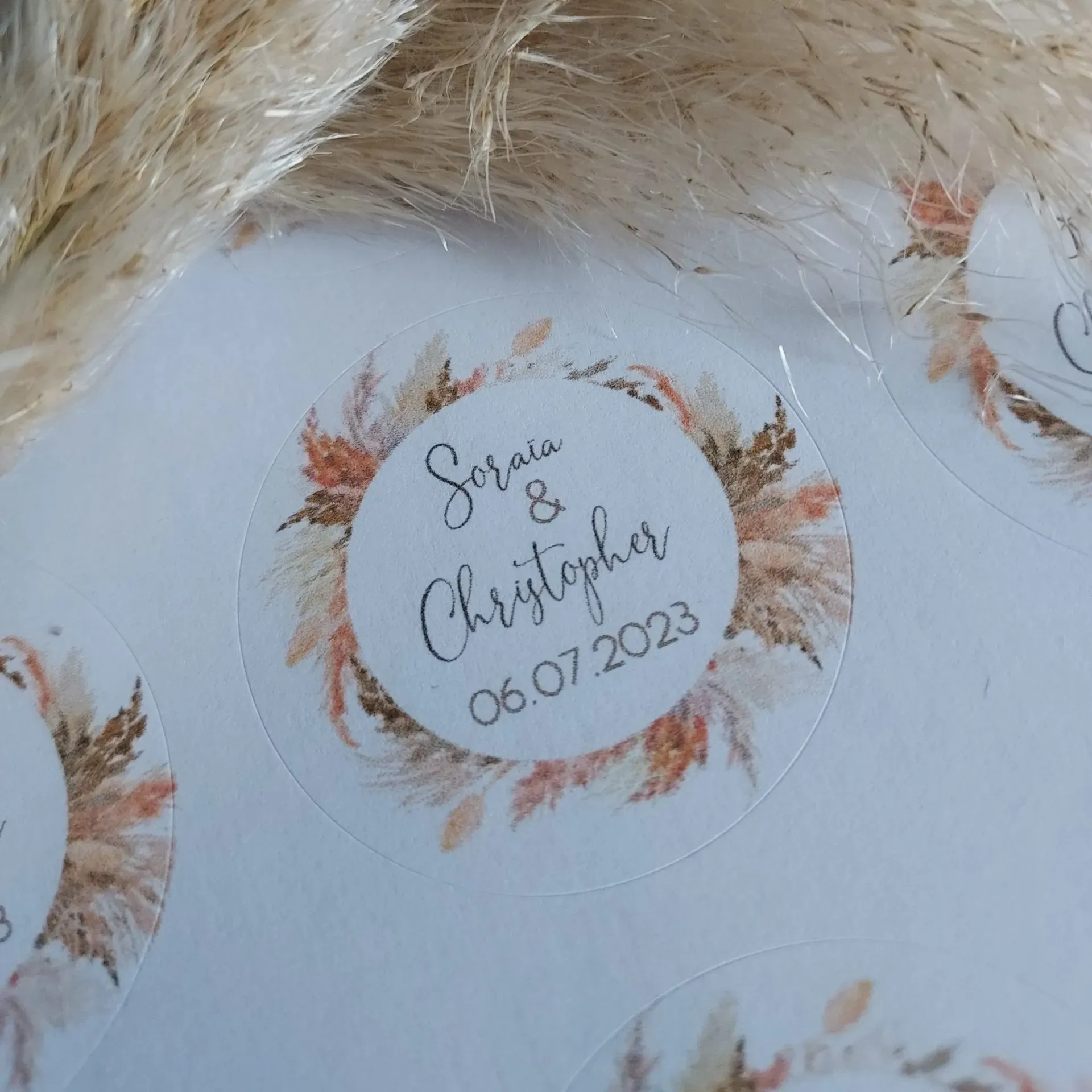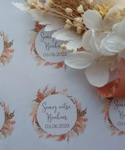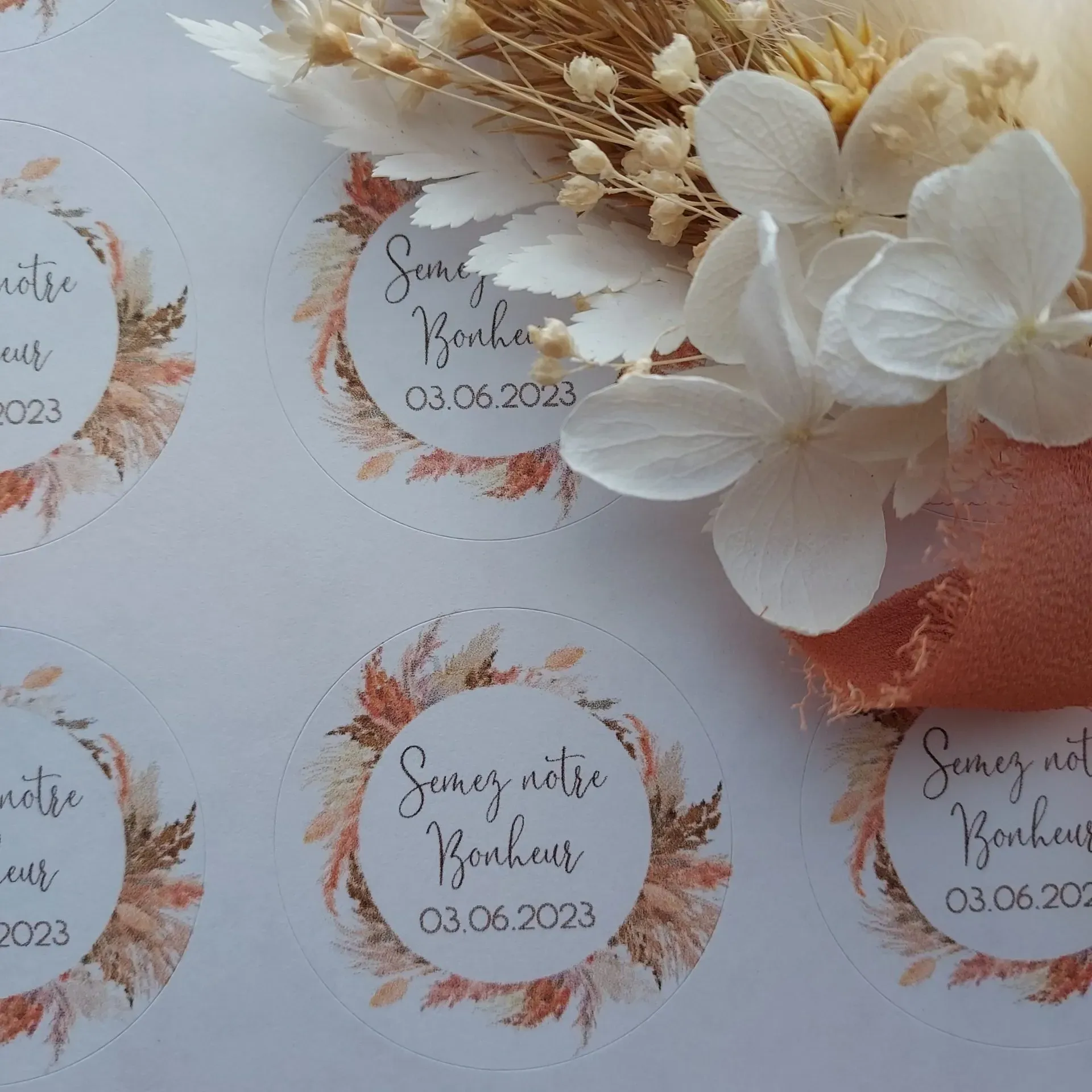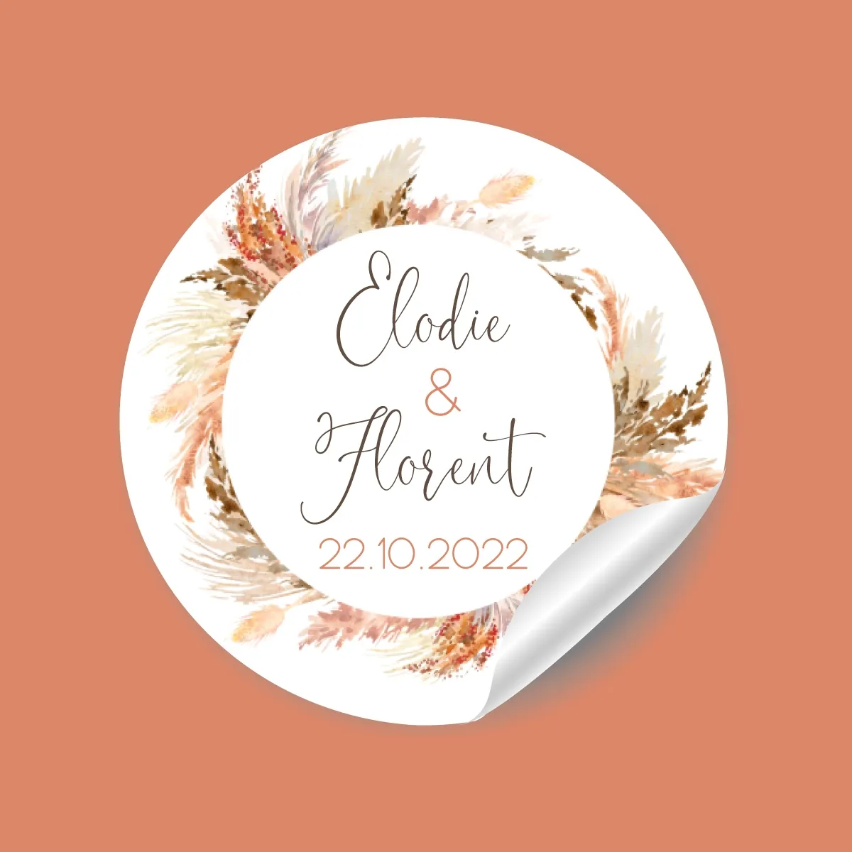 Jolies étiquettes autocollantes pour vos cadeaux invités, vos enveloppes de faire-part Mariage. Le thème Pampas terracotta est une valeur tendance.