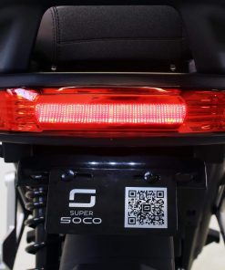 En termes d’équipements et de technologies embarquées, le Super Soco CPX n’est pas en reste face notamment au NIU NQi GTS ou encore au Rider 5000W. On note entre autre un système de démarrage keyless ainsi que le freinage couplé accompagné, pour votre sécurité, du CBS qui permet la réduction notable de la distance de freinage, mais aussi la présence d’une marche arrière, très pratique pour se garer en ville. Le CPX dispose aussi en option d’un support top case en acier carbone très robuste et résistant aux fortes vibrations, notamment si vous empruntez des routes pavées, par exemple. L’installation d’un top case plus classique nécessite l’installation d’une platine disponible en option. Une prise USB et un espace de rangement de 20 L viennent compléter la liste.